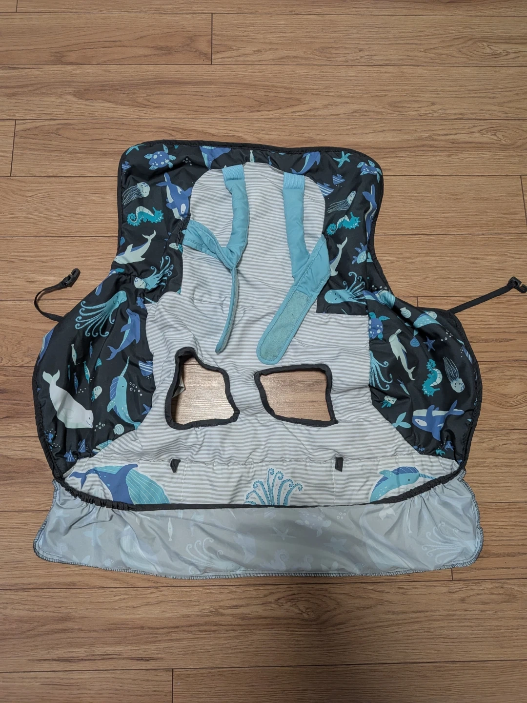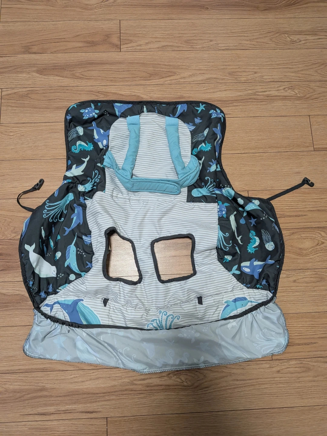 Here's a high chair or shopping cart cover for your little one! It features a cute ocean-themed design with whales, octopuses, and other sea creatures. It's in great condition and ready to use for your next grocery trip.