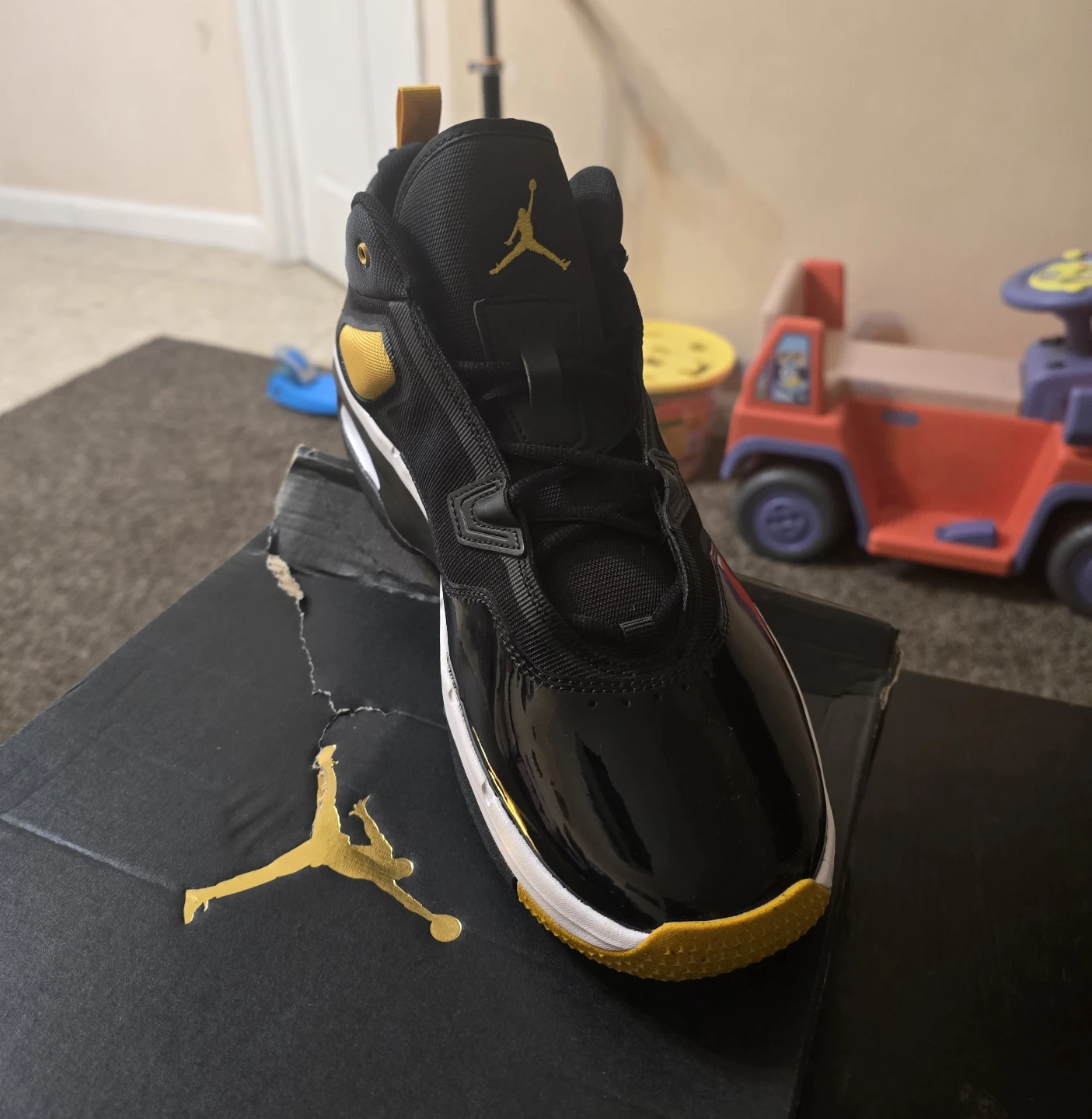 These are Jordan Stay Loyal 2 basketball shoes in black and gold. They're a US men's size 11.5. Features a patent leather toe and ankle collar.