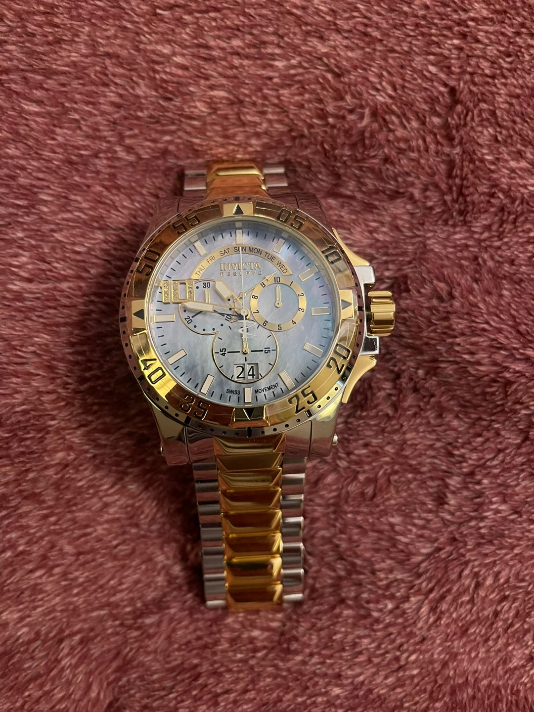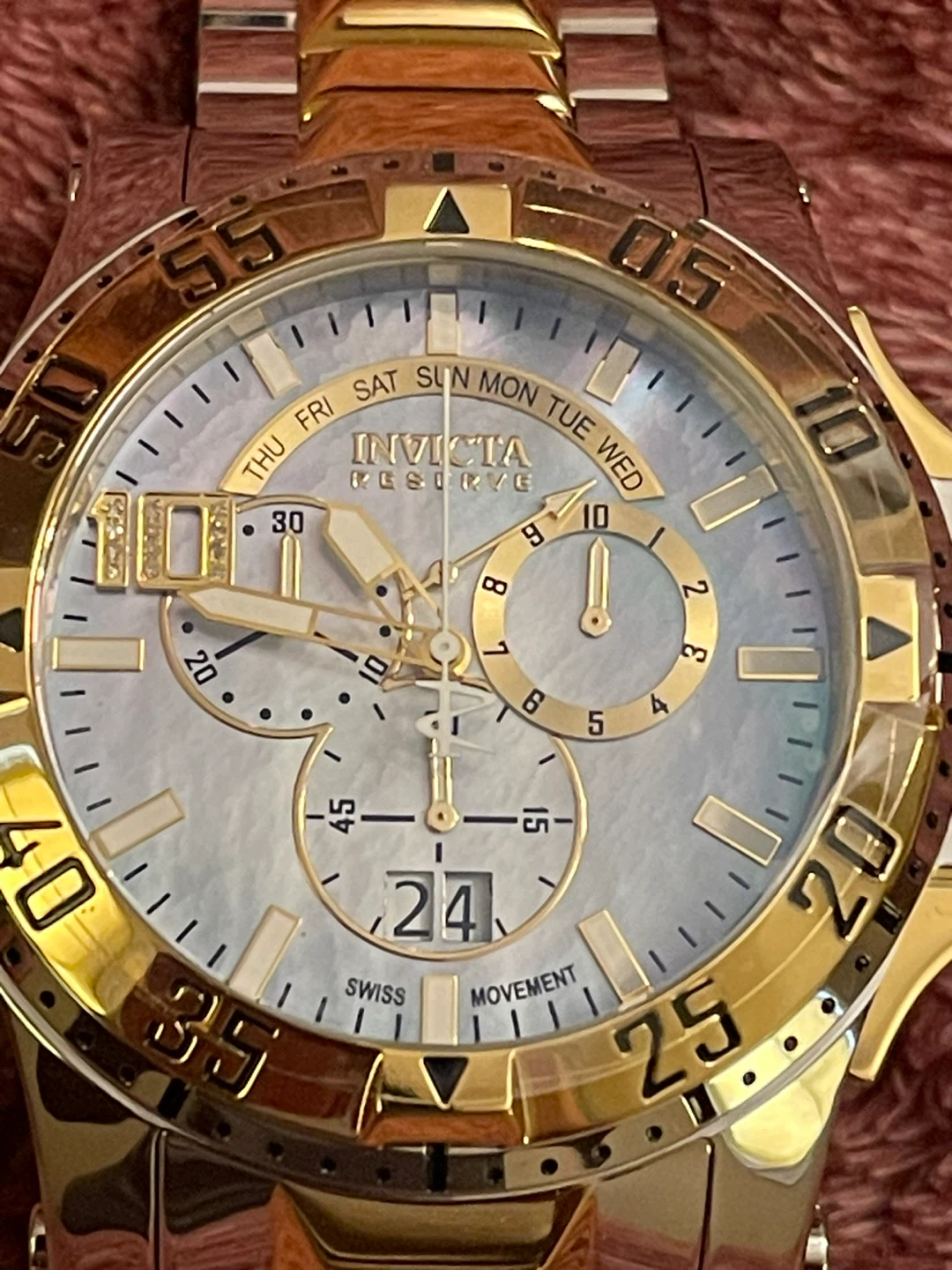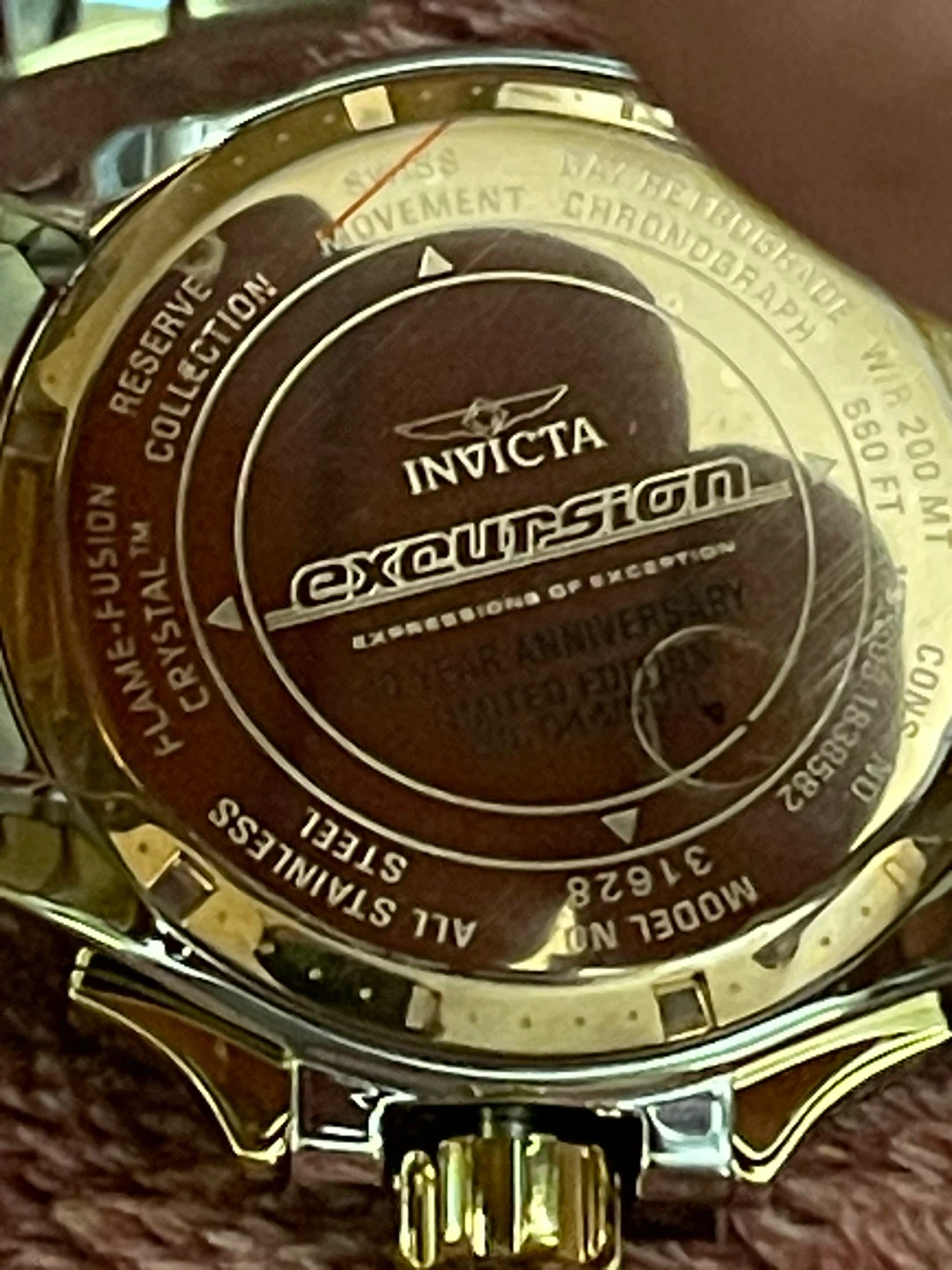 Invicta Excursion watch from the Reserve Collection. This is a 10 Year Anniversary Limited Edition, model number 31628. It features a Flame-Fusion Crystal and is made of All Stainless Steel. Water resistant up to 200 meters.