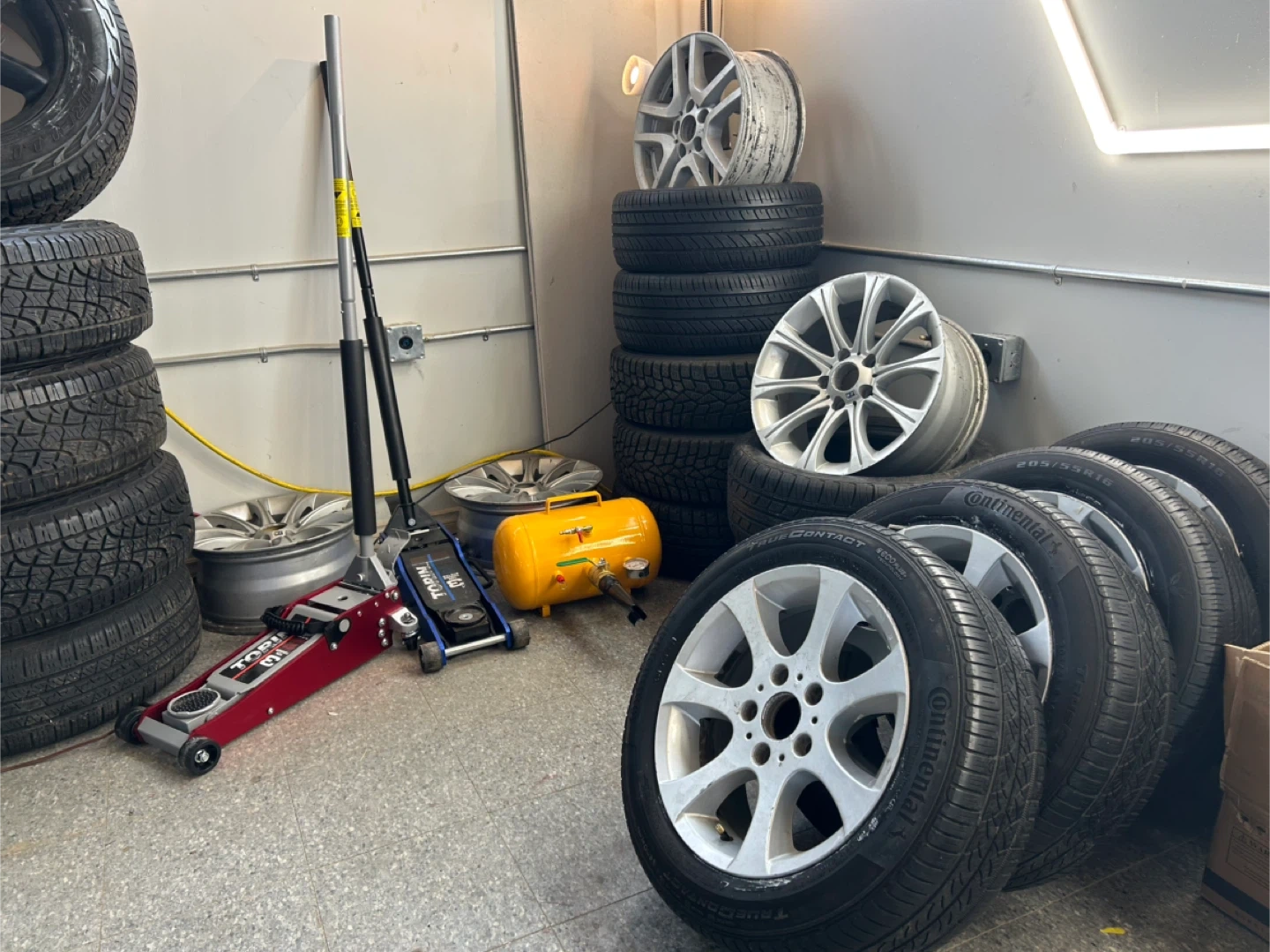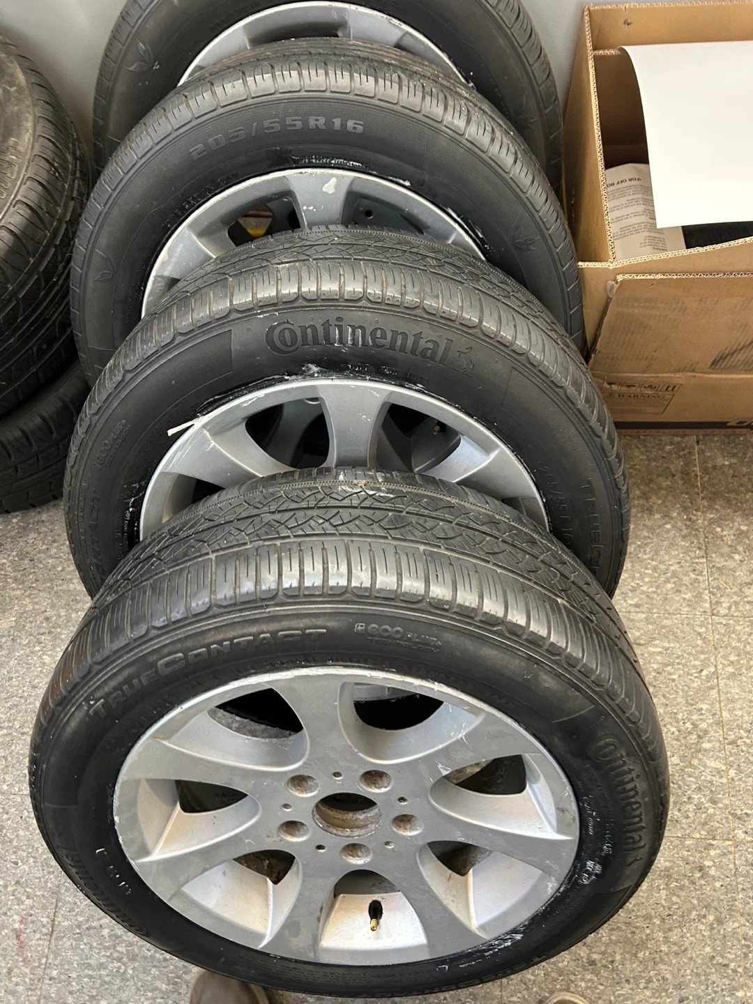 Pair of Continental TrueContact tires & Kaspen all seasons, size 205/55R16, mounted on BMW 162 16 inch alloy rims. These tires are suitable for various seasons and offer a quiet ride. They're in good condition and ready for installation.