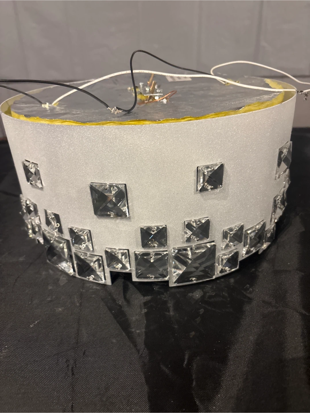 A stylish drum-shaped light fixture with a frosted glass top. It's adorned with sparkling square-cut acrylic crystals around the white cylinder. This light fixture adds a touch of elegance to any room!