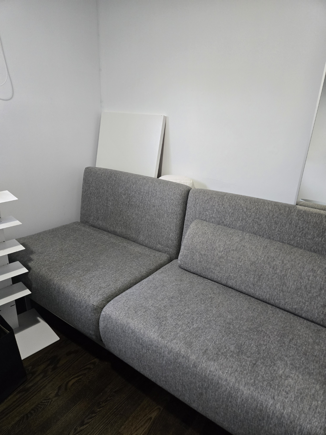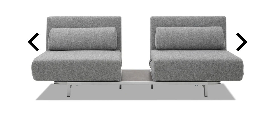 Comfortable sofa bed, converts easily. Two separate seating sections with connecting table. Sleek metal legs. Grey fabric upholstery. Includes two pillows.