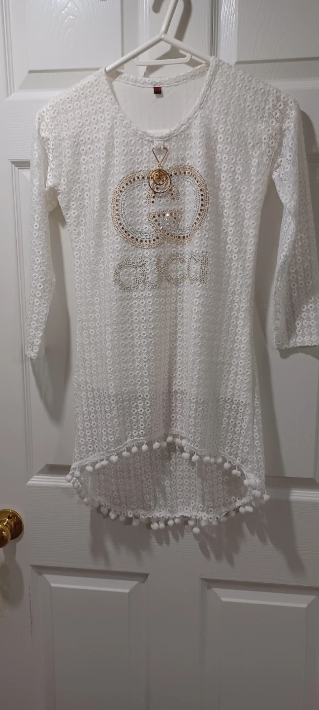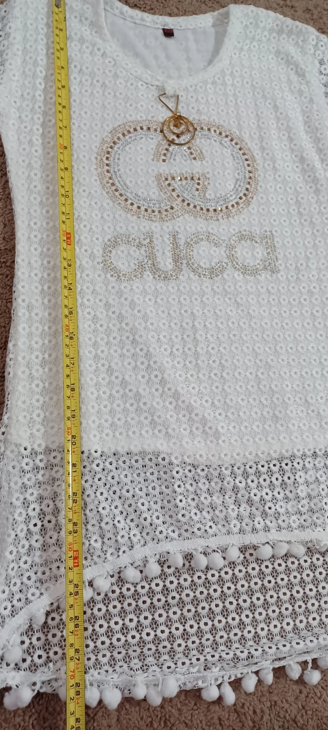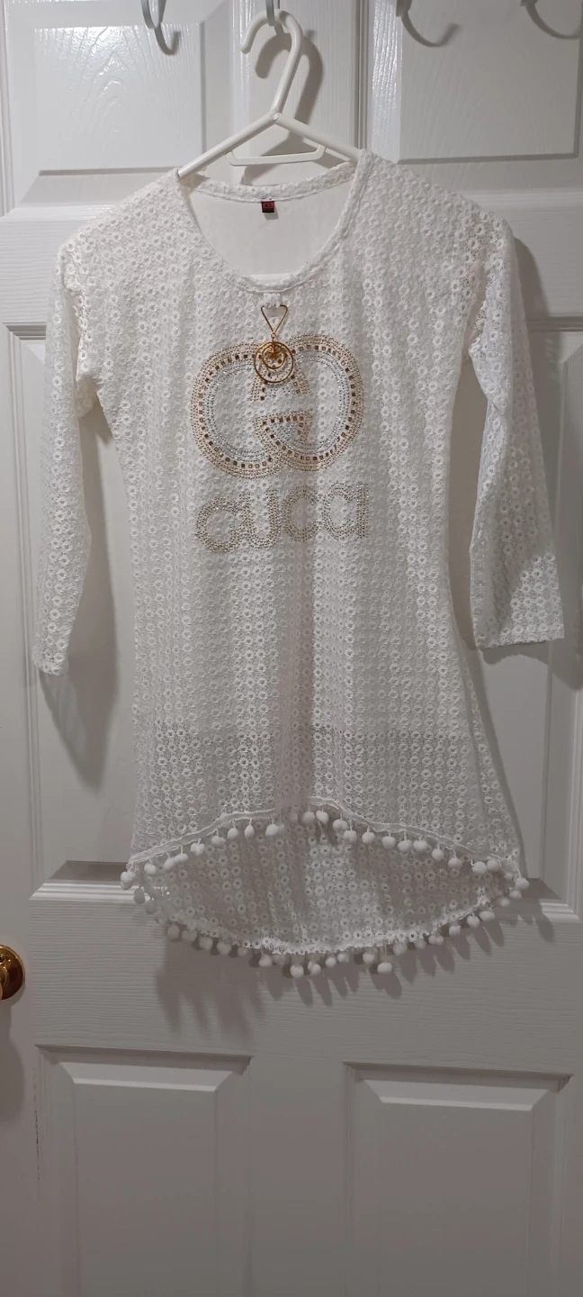 White lace tunic with a gold and silver embellished logo on the front. It features a pom-pom trim along the hem. Sleeve length is 3/4.