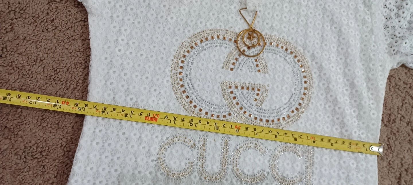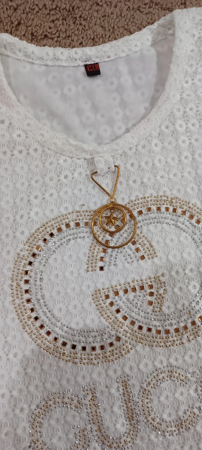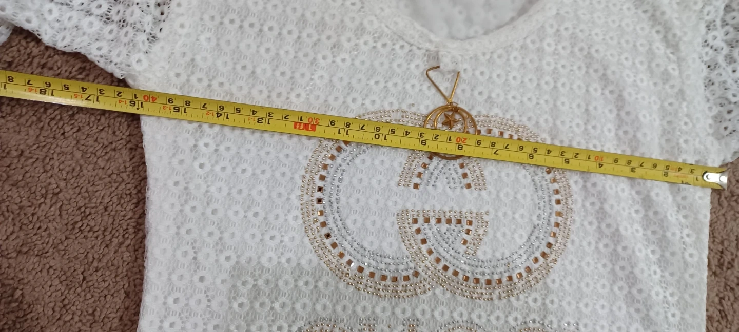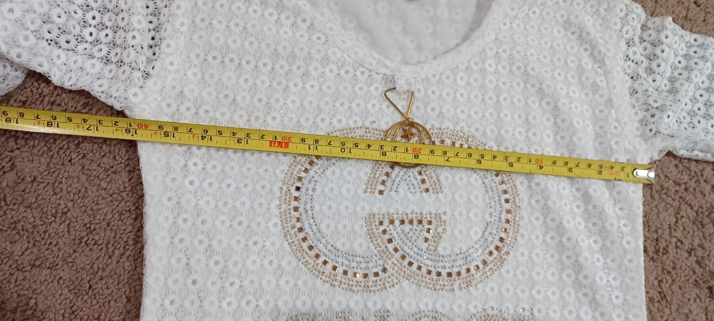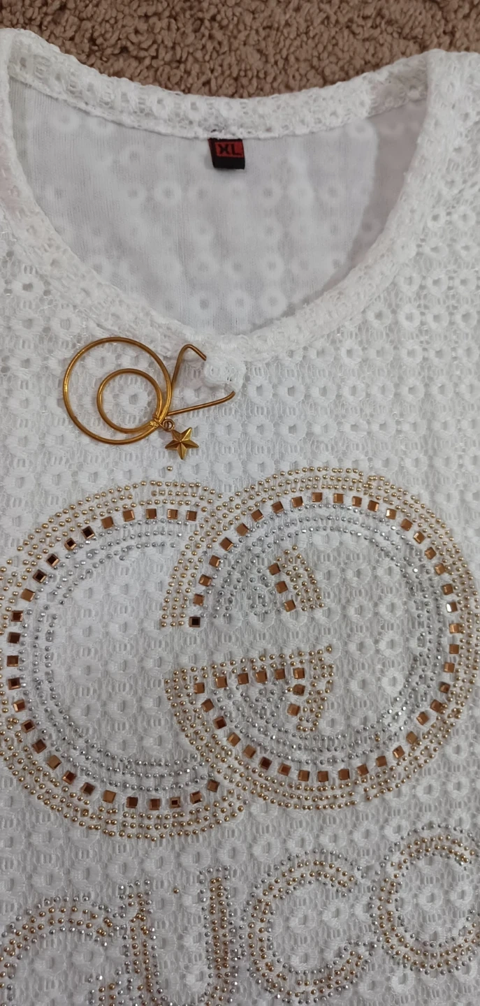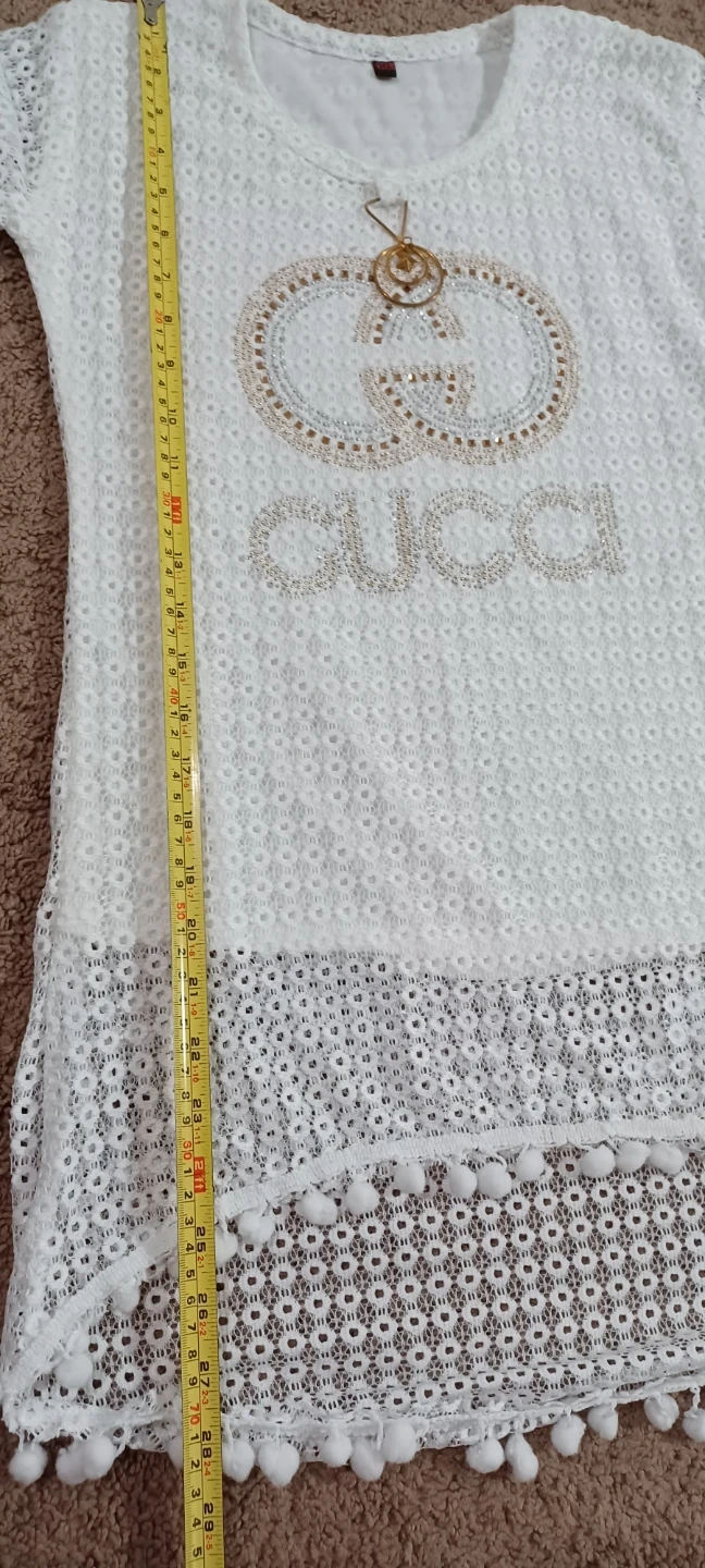 White lace tunic with a gold and silver embellished logo on the front. It features a pom-pom trim along the hem. Sleeve length is 3/4.