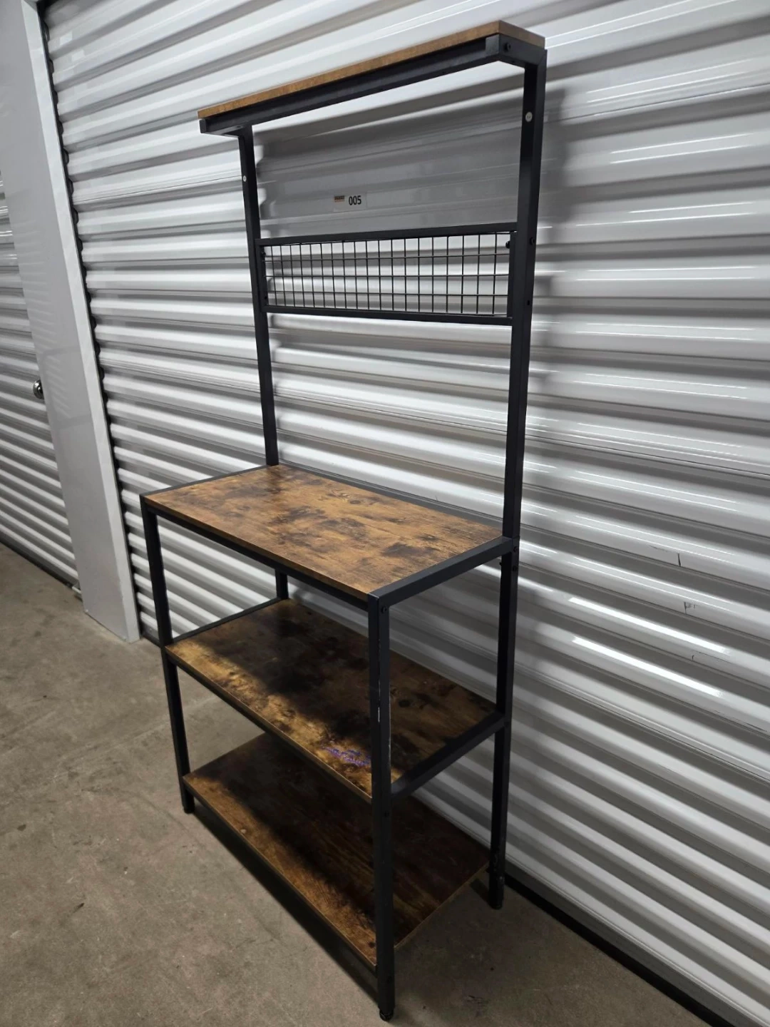 This rack features a rustic wood grain finish and a durable black metal frame. Great for organizing home essentials!
