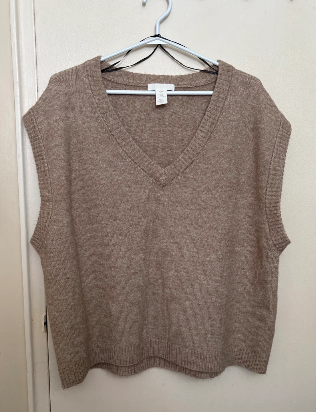 This is an H&M sleeveless knit vest. It's a medium size with a V-neckline. The material is a soft knit blend.