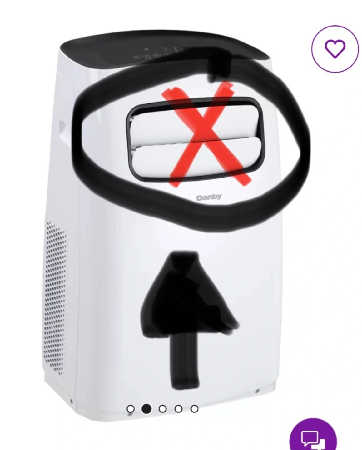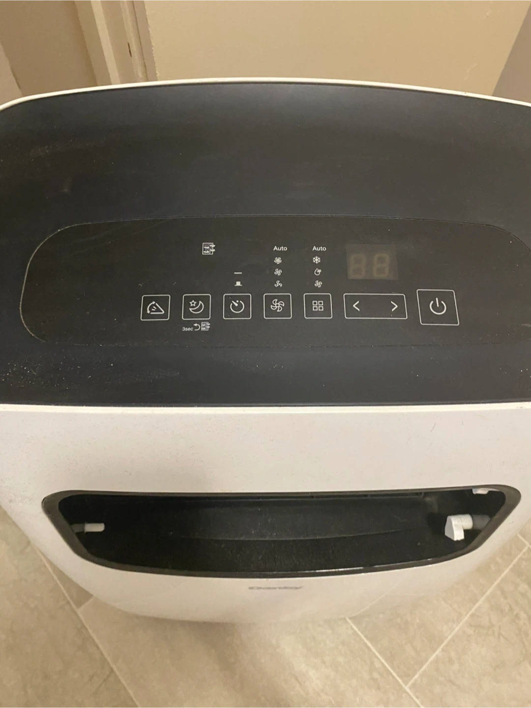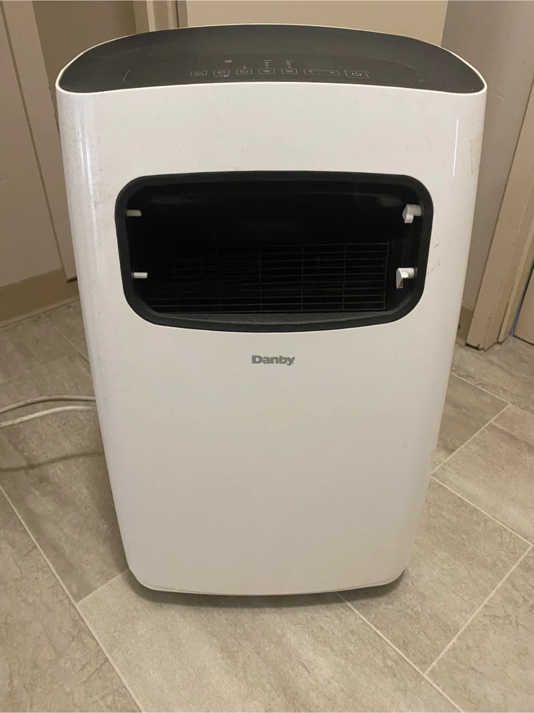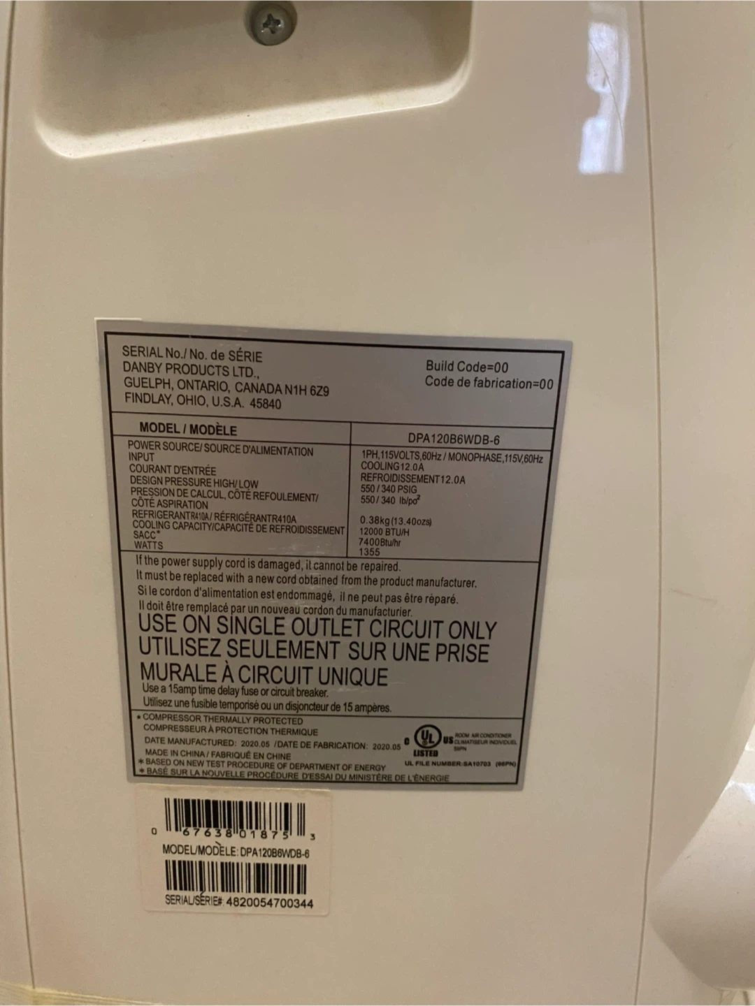 This is a Danby portable air conditioner. It's a DPA120B6WDB-6 model. The unit is white and black. It has multiple control settings on the top panel. Manufactured in 2020.05.