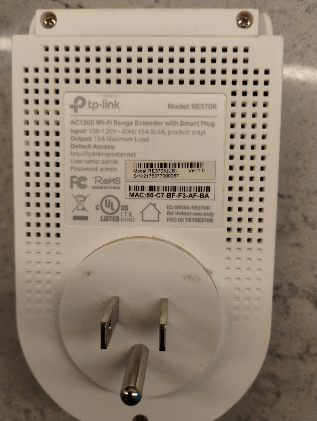 TP-Link AC1200 Wi-Fi Range Extender with Smart Plug. Extends your Wi-Fi network range for better coverage. Input voltage 100-120V, 60Hz 15A (product only). MAC address is 50-C7-BF-F3-AF-BA.
