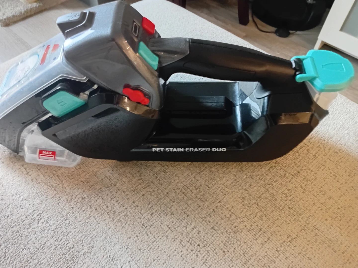 Bissell Pet Stain Eraser Duo cordless spot cleaner. It's designed for tackling pet messes on carpets and upholstery. Has a detachable tank for easy emptying. Used twice, very clean.