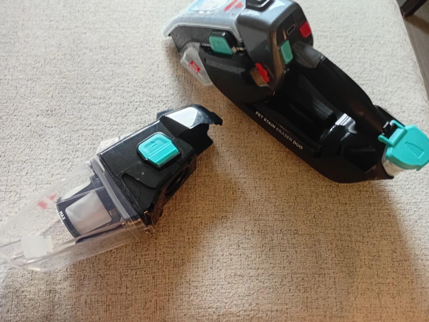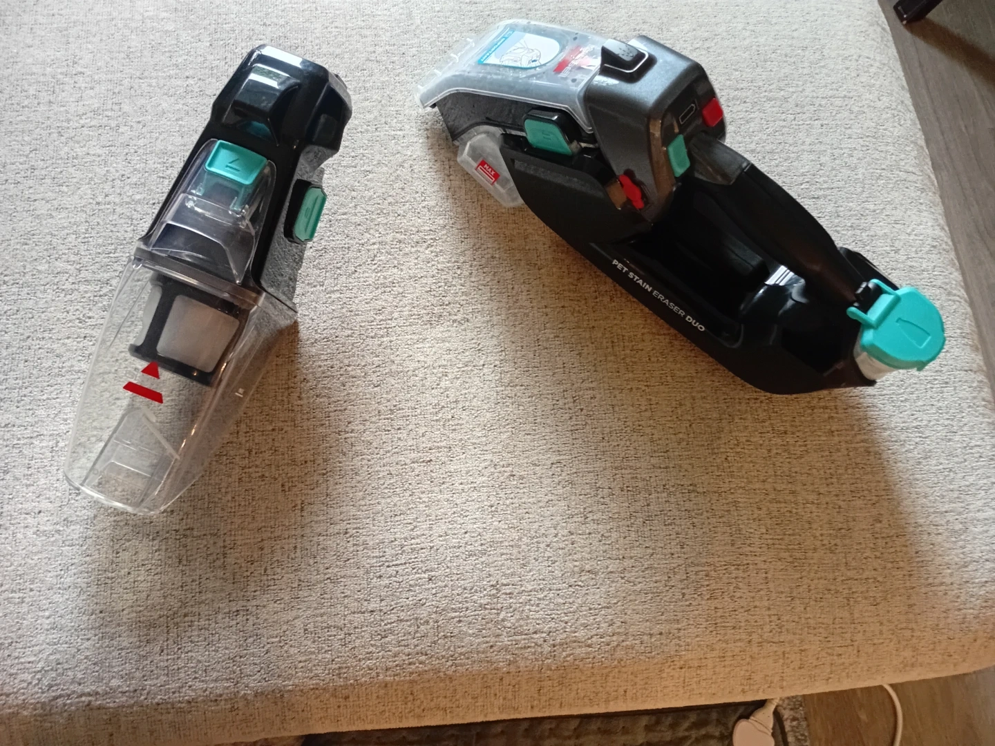 Bissell Pet Stain Eraser Duo cordless spot cleaner. It's designed for tackling pet messes on carpets and upholstery. Has a detachable tank for easy emptying. Used twice, very clean.