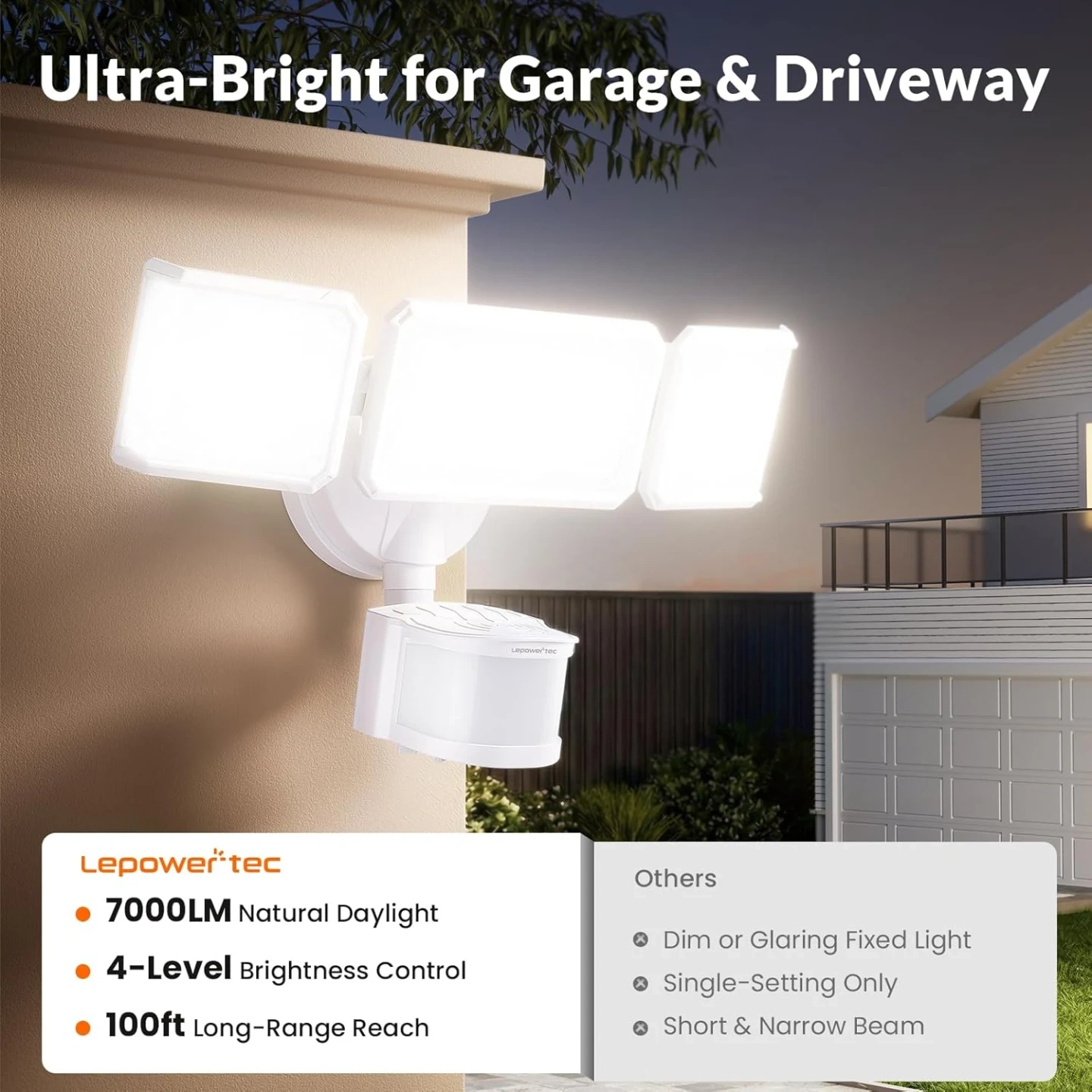 7000 Lumens. Daylight When You Need It. The LED floodlight triple-panel design floods your garage and driveway with crisp, natural light—adjustable from soft glow to full daylight. Single garage? Set it soft. Double garage? Crank it up. Every corner visible. Every step safer. No glare, no guesswork