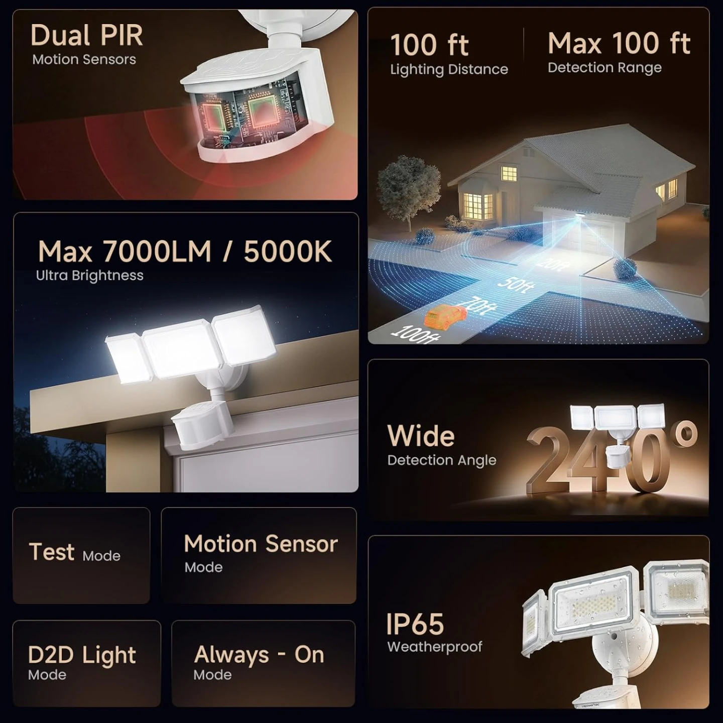 Zero Blind Spots Outdoor Security Light with 240° & 100ft Dual PIR Motion Sensor, 7000LM Adjustable Flood Light Brightness for Garage Driveway, Dusk to Dawn, IP65, Easy Hardwired Install, Brand New in the Box/Sealed