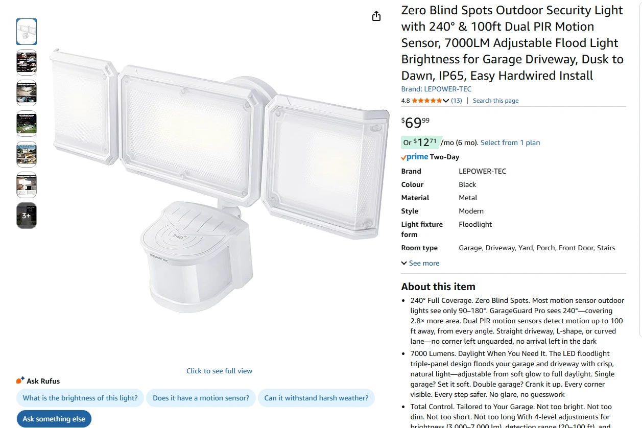 Total Control. Tailored to Your Garage. Not too bright. Not too dim. Not too short. Not too long With 4-level adjustments for brightness (3,000–7,000 lm), detection range (20–100 ft), and duration (1–10 min), you decide exactly how your garage responds—day or night. Set it soft for everyday. Crank it up when security calls. Designed for the garage. Smart enough for everything else