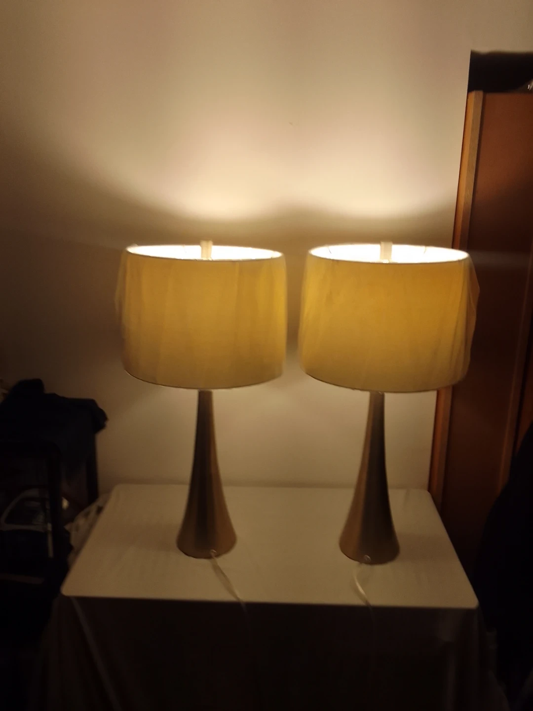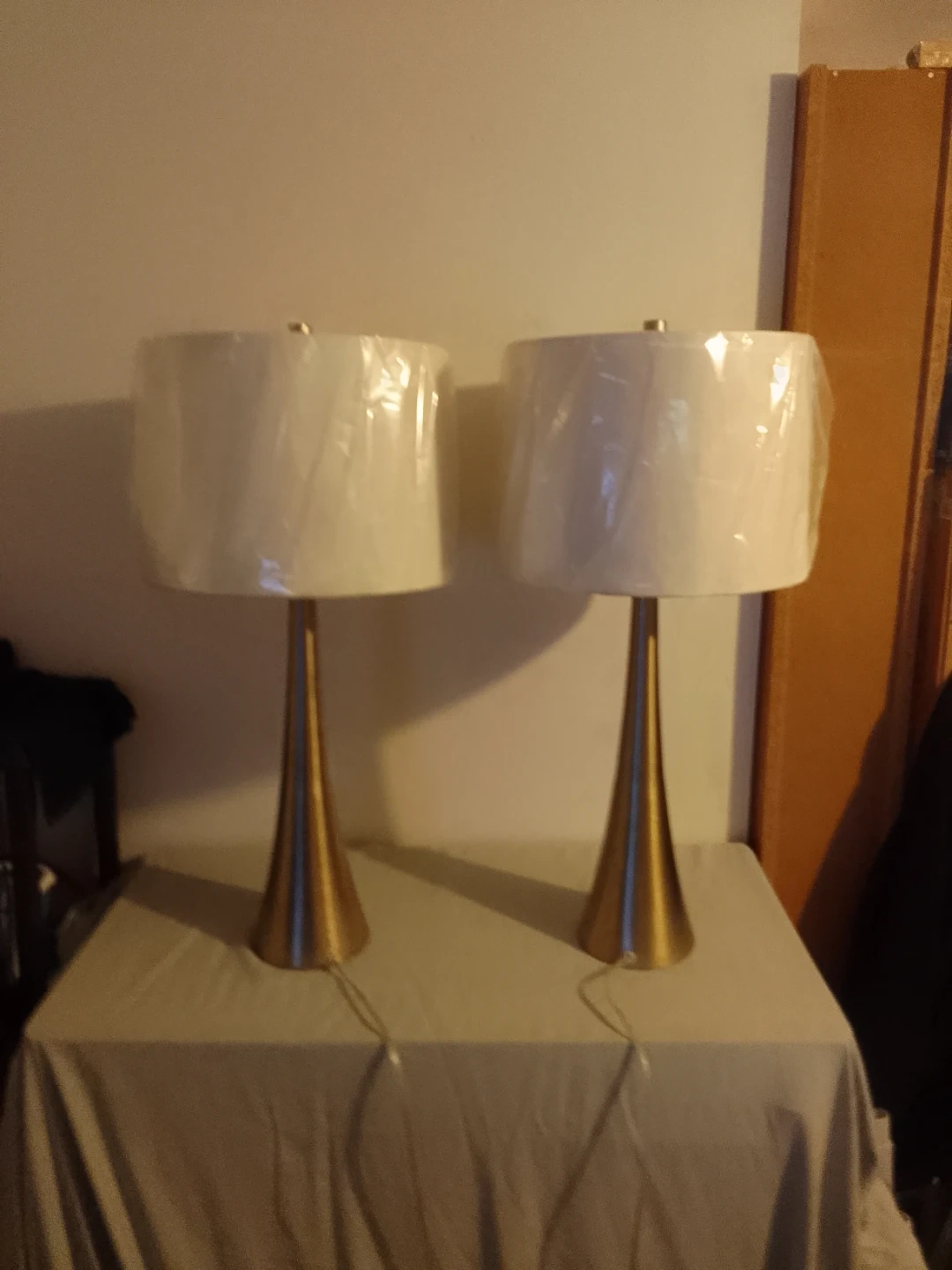 Two stylish table lamps with a gold-coloured conical base and cream fabric shades. They're perfect for adding warm ambient lighting to your living room or bedroom. Each lamp comes with 1 Great Value 10.5 Watt 120Volt light bulb. Each base has some small scratches.