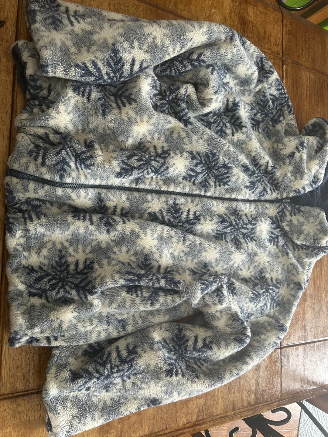 Denali fleece jacket with a snowflake pattern. It's a full-zip style. Made of soft fleece material. Great for staying cozy!