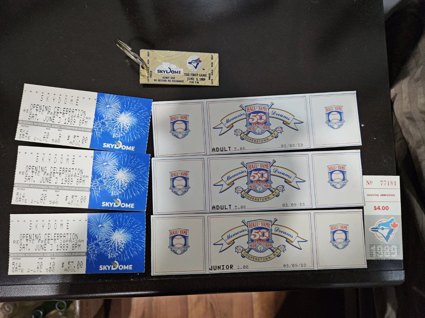 Three SKYDOME Opening Celebration tickets from June 3, 1989. Also includes three Hall of Fame admission tickets from Cooperstown, N.Y., dated August 9, 1989. These are great collector's items for baseball fans!