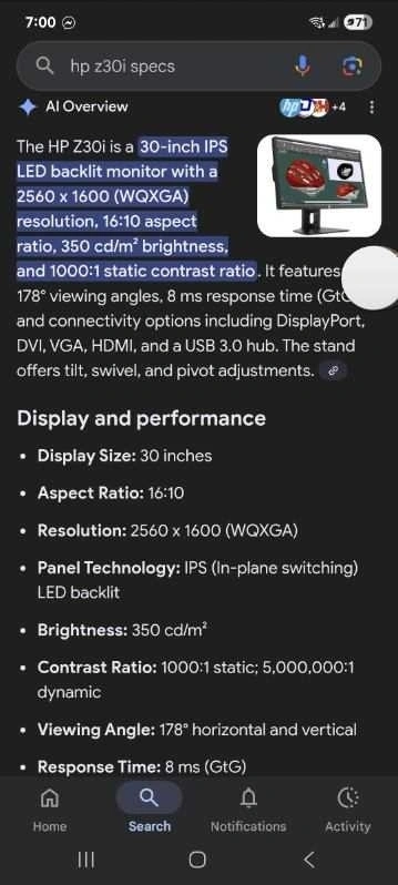 I'm selling my HP Z30i 30-inch IPS LED backlit monitor, which boasts a 2560 x 1600 WQXGA resolution, a 16:10 aspect ratio, and 350 cd/m² brightness. This monitor is great for productivity and delivers excellent image clarity!