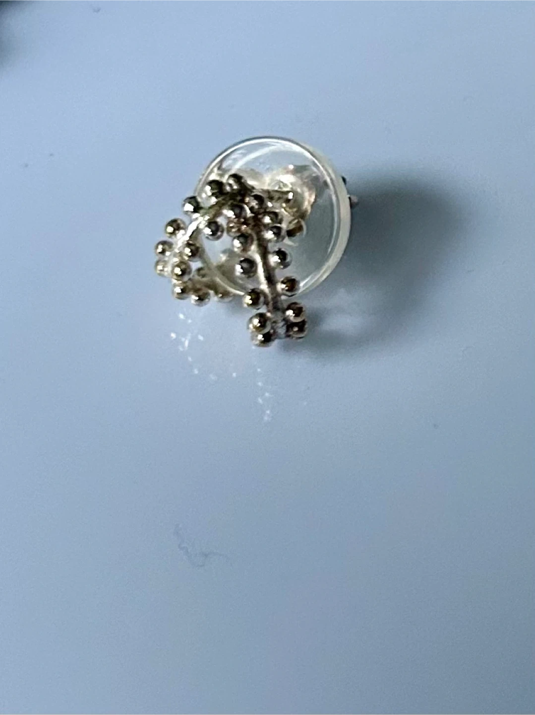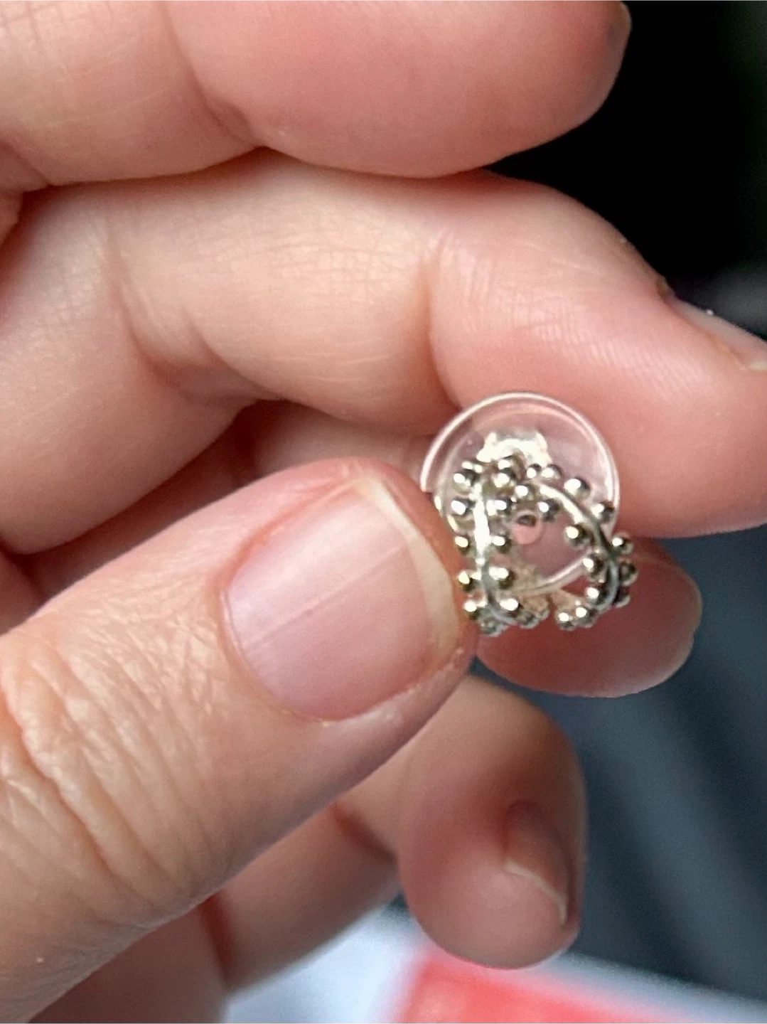 These stud earrings feature a beaded tiny hoop design in a silver. They're lightweight and easy to wear. The post backs are clear plastic.