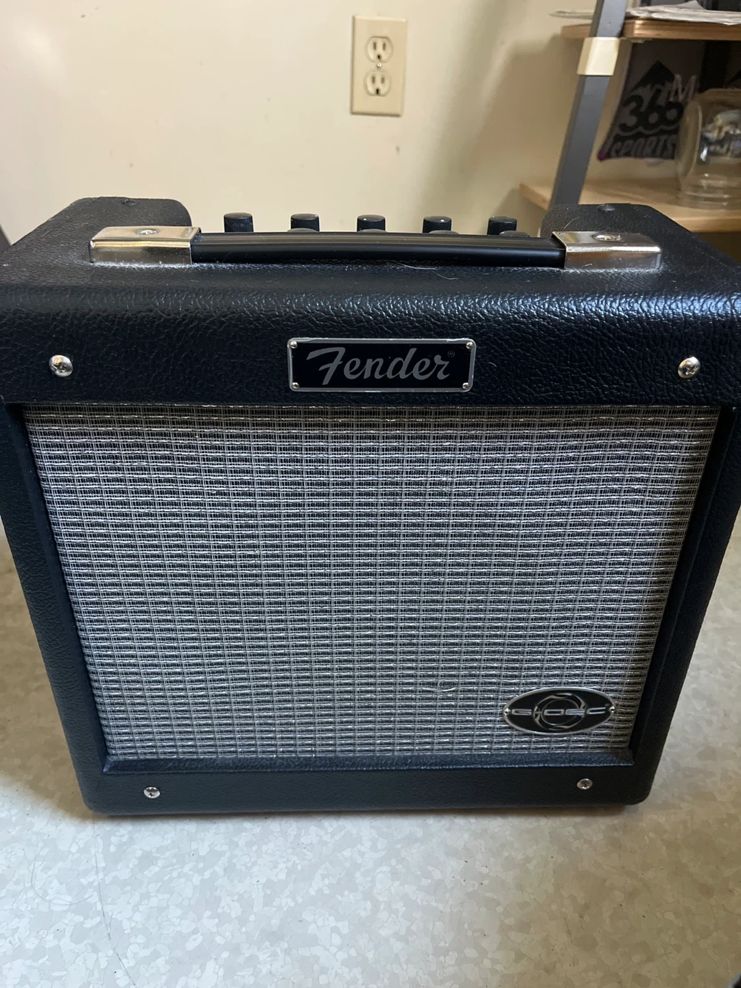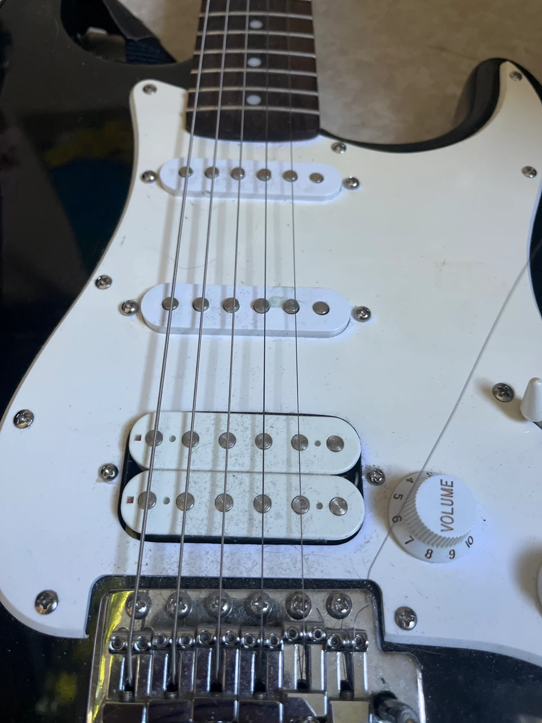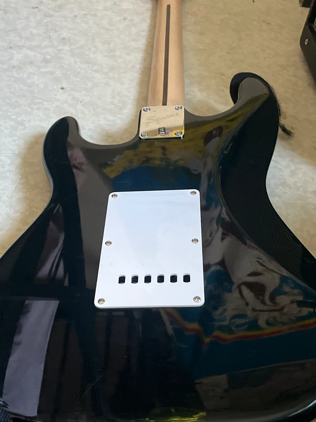 This is a black Squier Stratocaster electric guitar. It has a maple neck and a rosewood fretboard. It comes with a strap attached and amp and its cord , on the downside it’s missing its high E string.