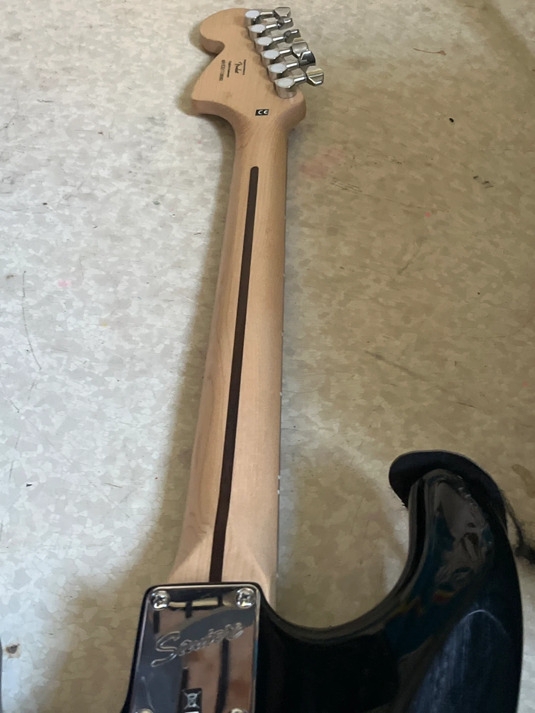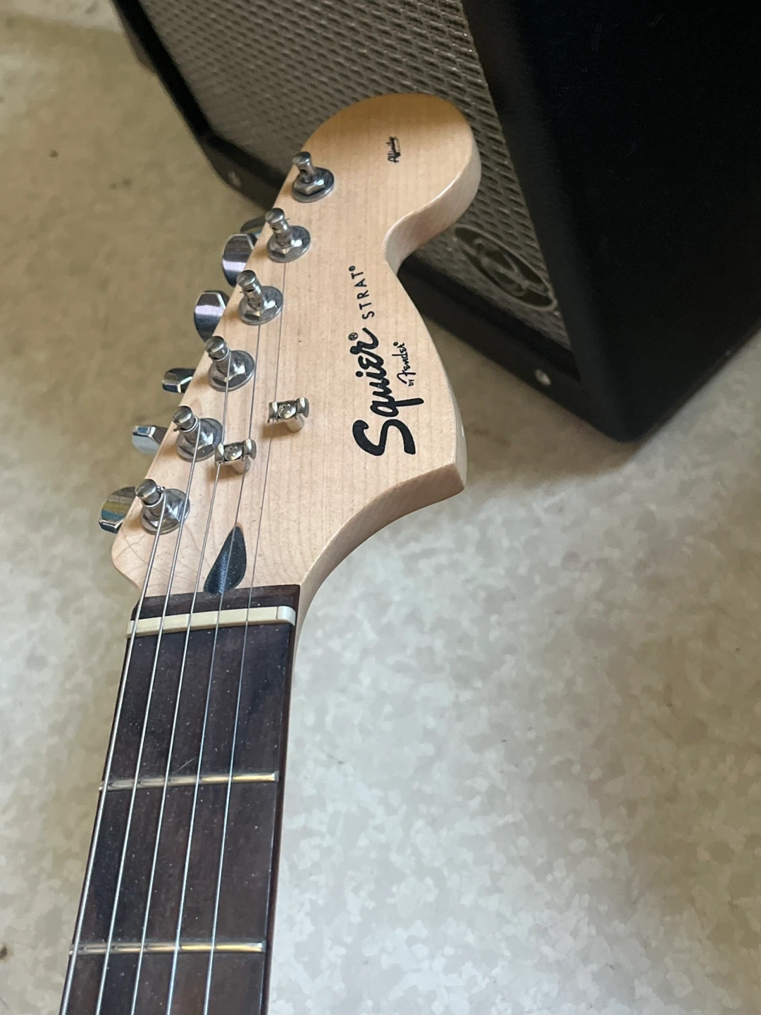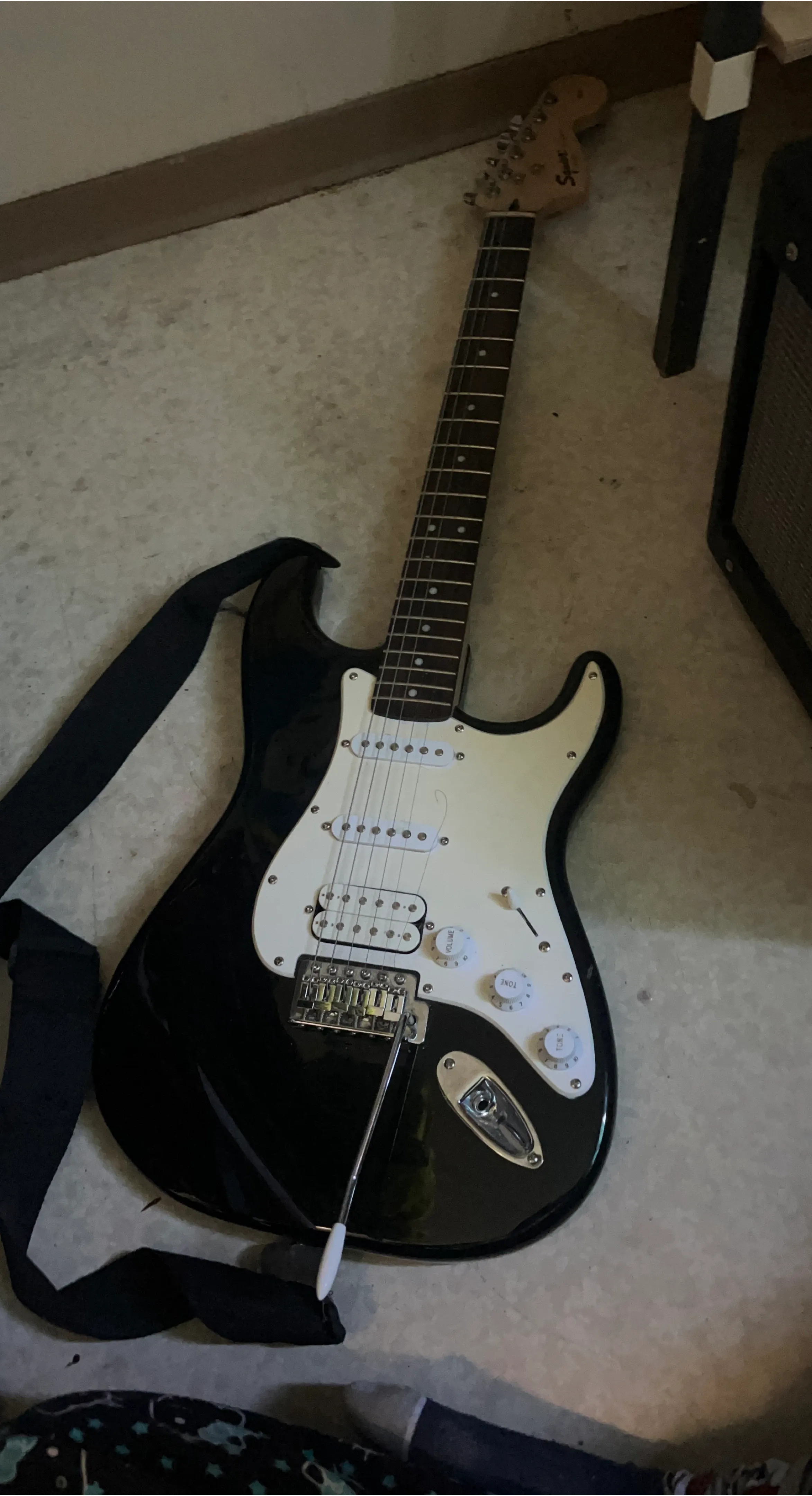 This is a black Squier Stratocaster electric guitar. It has a maple neck and a rosewood fretboard. It comes with a strap attached and amp and its cord , on the downside it’s missing its high E string.