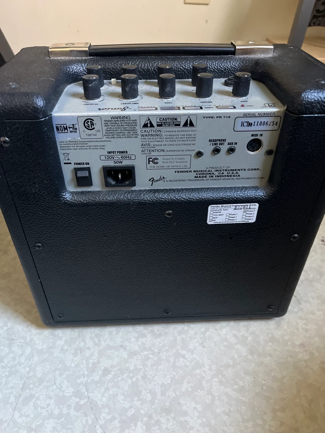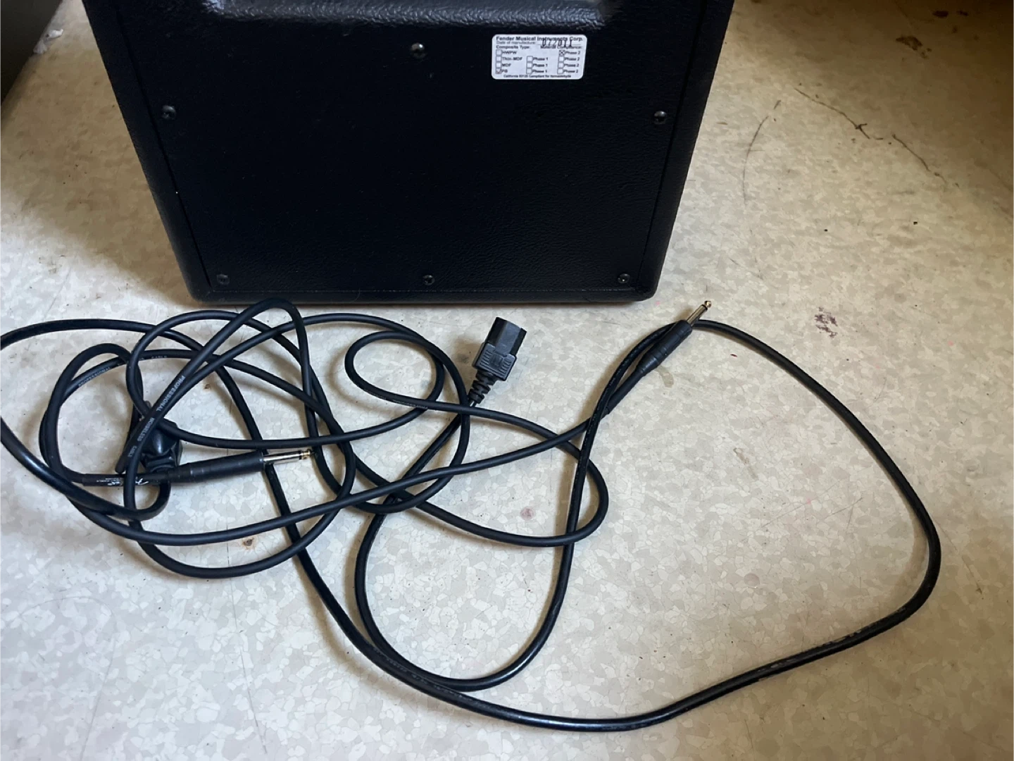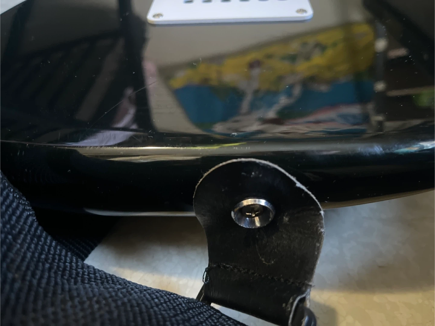 This is a black Squier Stratocaster electric guitar. It has a maple neck and a rosewood fretboard. It comes with a strap attached and amp and its cord , on the downside it’s missing its high E string.