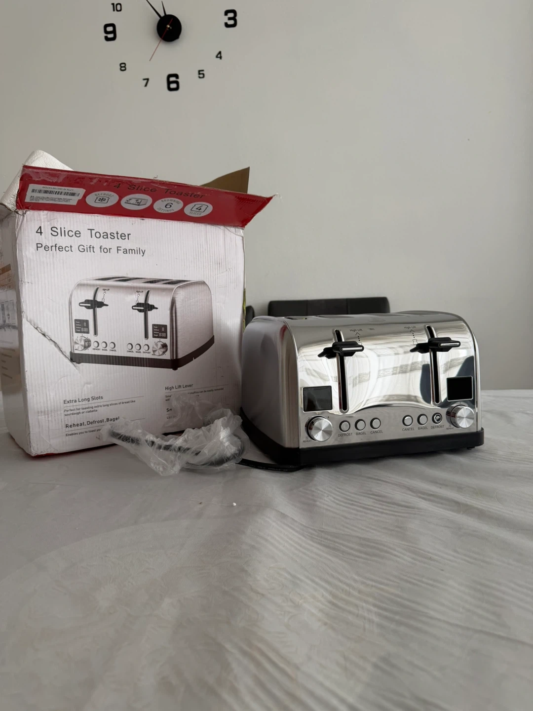 Selling a 4-slice toaster, perfect for the whole family! It comes with extra long slots, ideal for toasting those longer slices of bread like sourdough or ciabatta. The high lift lever makes it easy to remove small crumpets and muffins without burning your fingers. It also has a smart display with a count-down timer setting and function. The box is included!