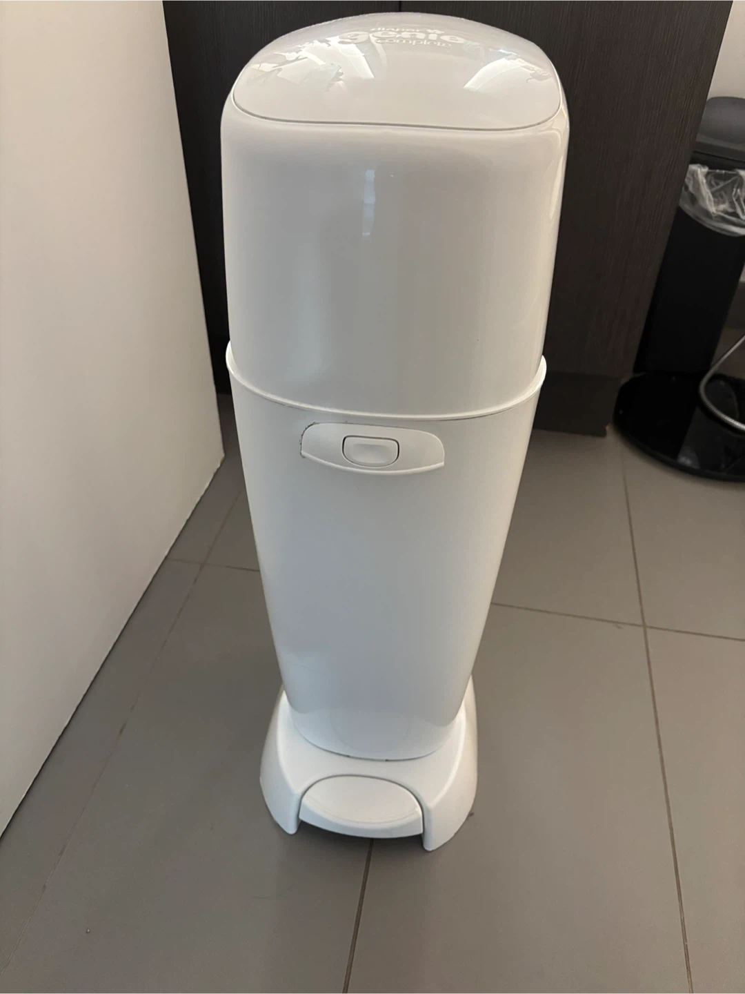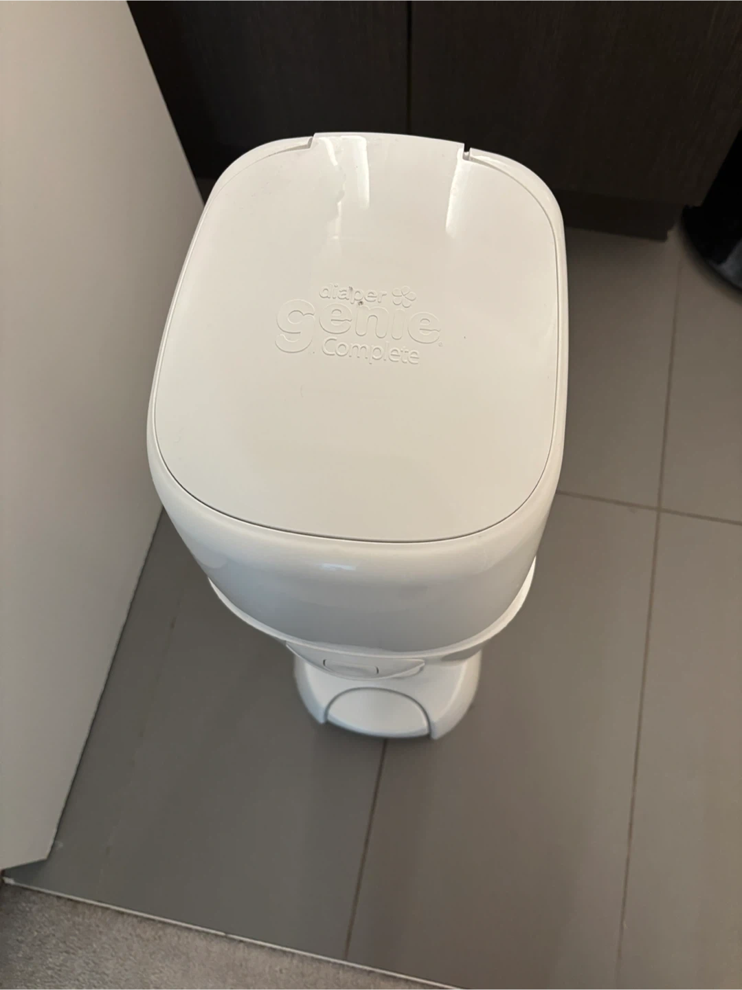 This white Diaper Genie Complete diaper pail helps control odours. It's made of durable plastic and features a foot pedal for hands-free operation. The multi-layer bag system traps smells effectively.