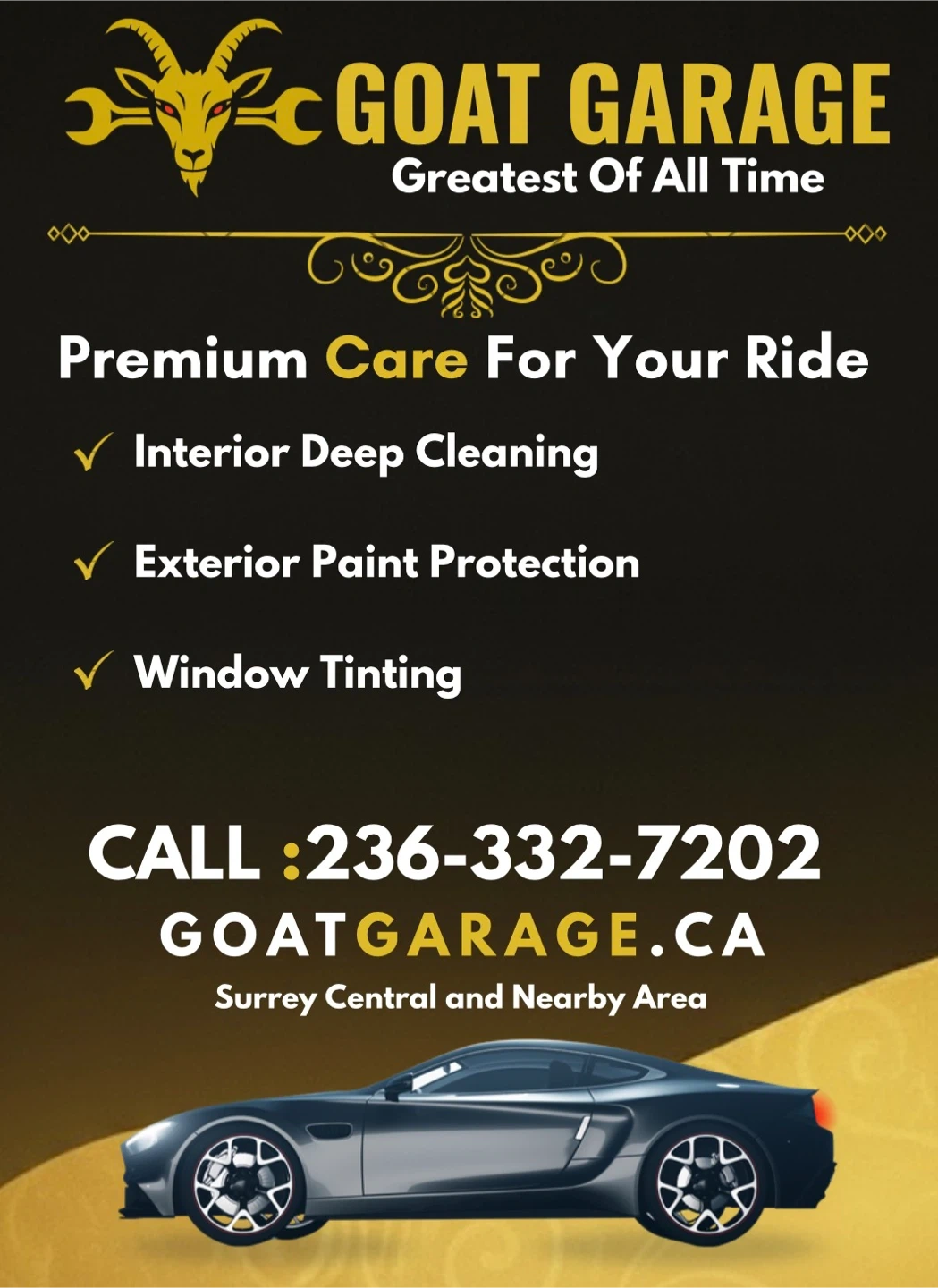 Premium care for your ride! Offering interior deep cleaning, exterior paint protection, and window tinting services. call 236-332-7202 for appointments in Surrey Central and nearby areas.