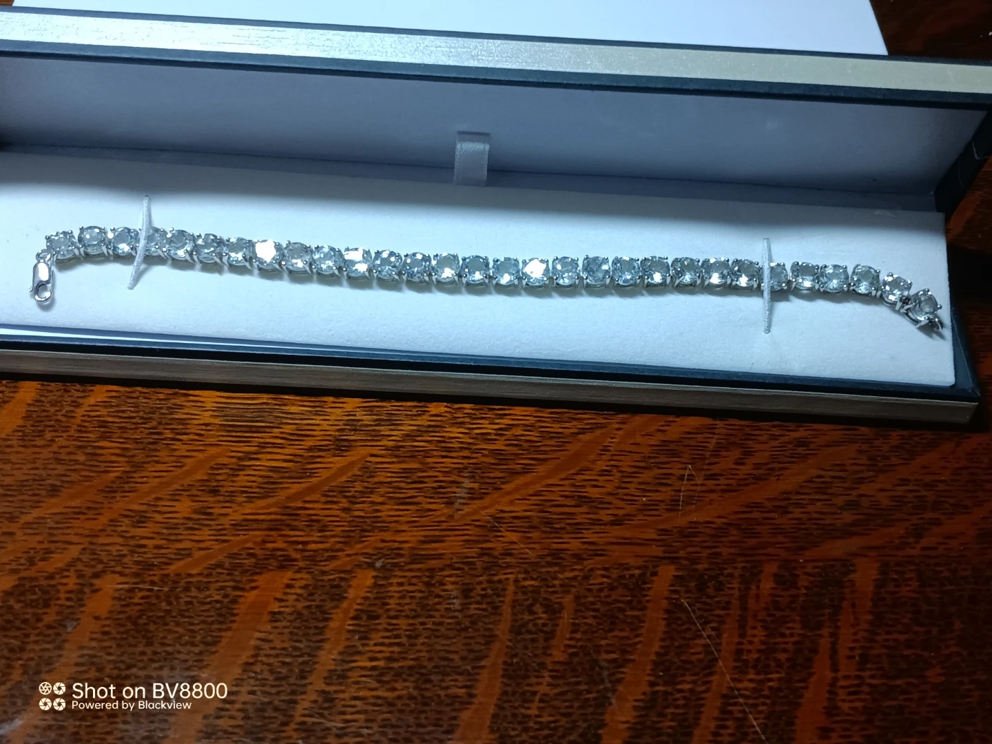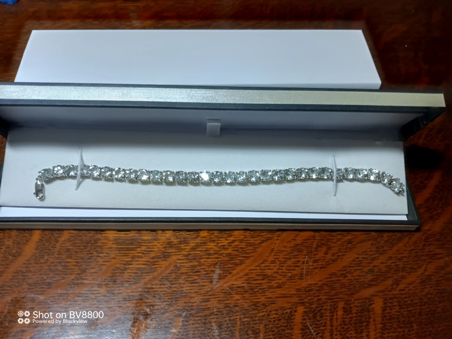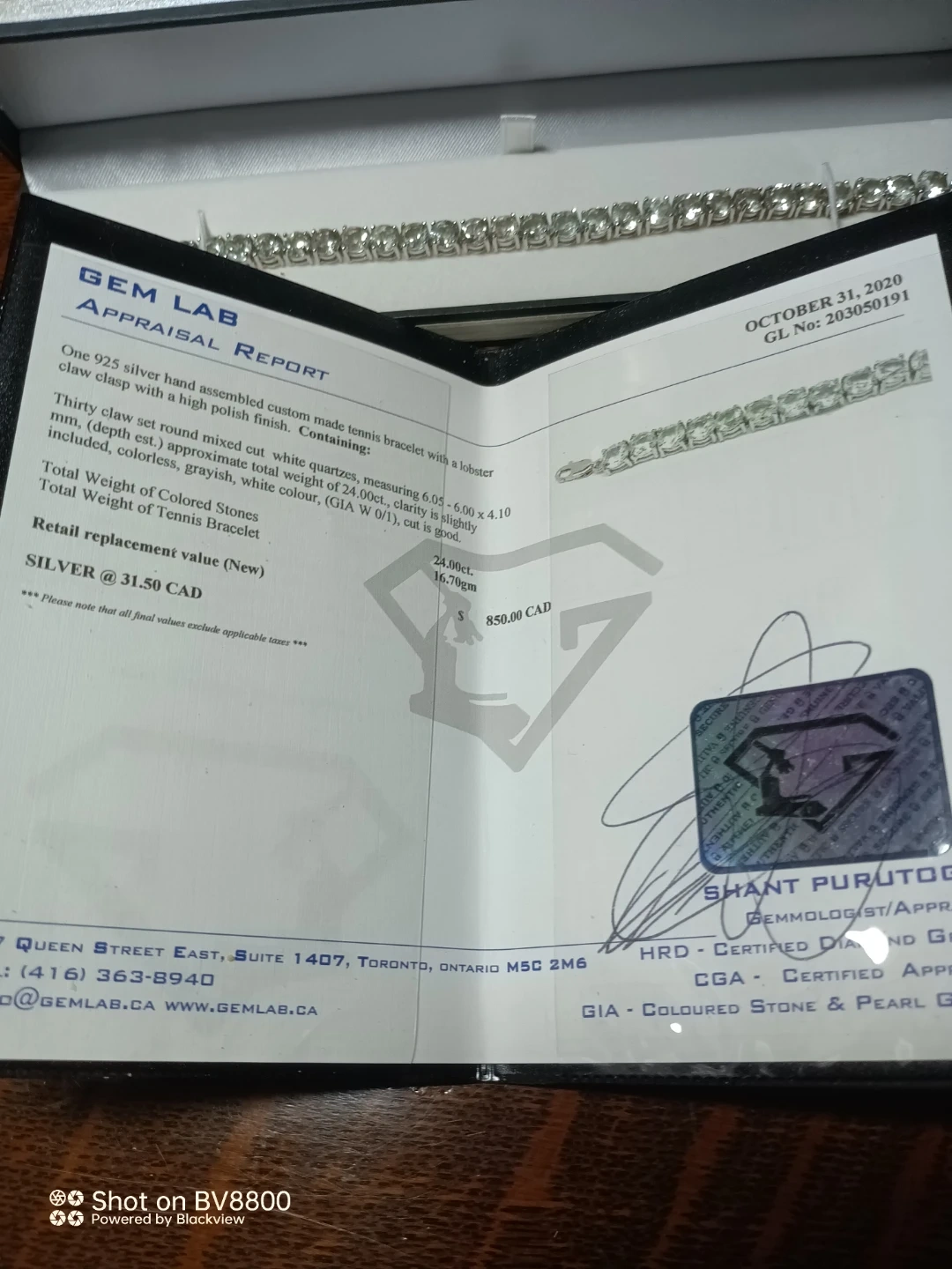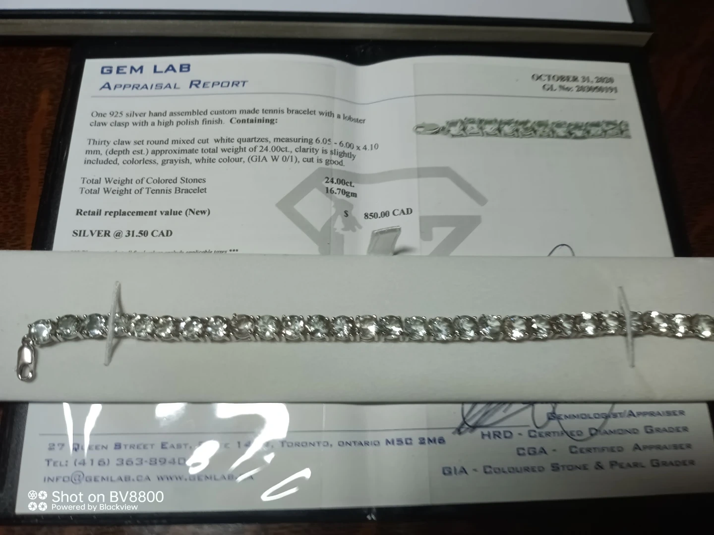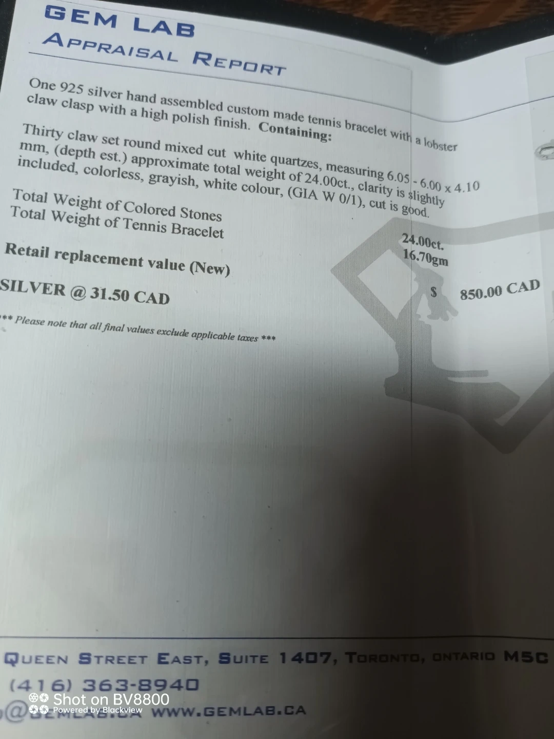 Selling a 925 silver hand-assembled custom-made tennis bracelet. It features a lobster claw clasp and a high polish finish. The bracelet contains thirty claw-set round mixed-cut white quartz stones, measuring approximately 6.05 - 6.00 x 4.10 mm, with a total weight of 24.00ct. The clarity is slightly included, colourless, grayish, white (GIA W 0/1), and the cut is good. Retail replacement value (new) is $850.00 CAD