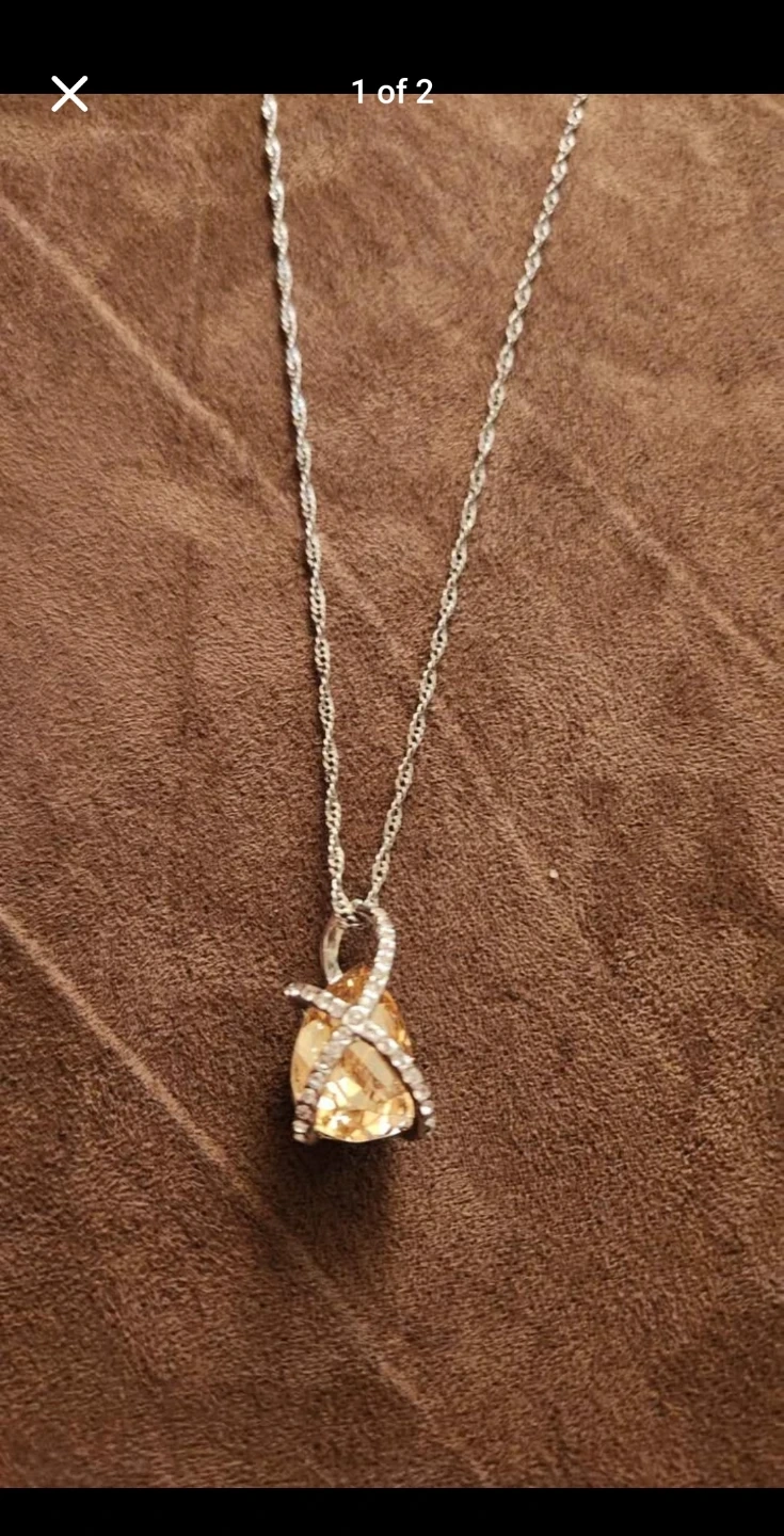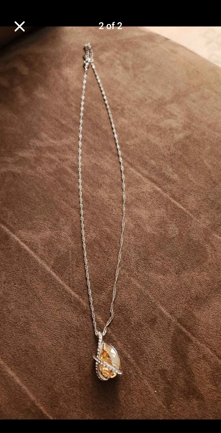 Swarovski necklace features a teardrop-shaped, champagne-coloured gemstone pendant. The pendant is accented with a twisted silver design. It's a lovely accessory for everyday wear or special occasions.