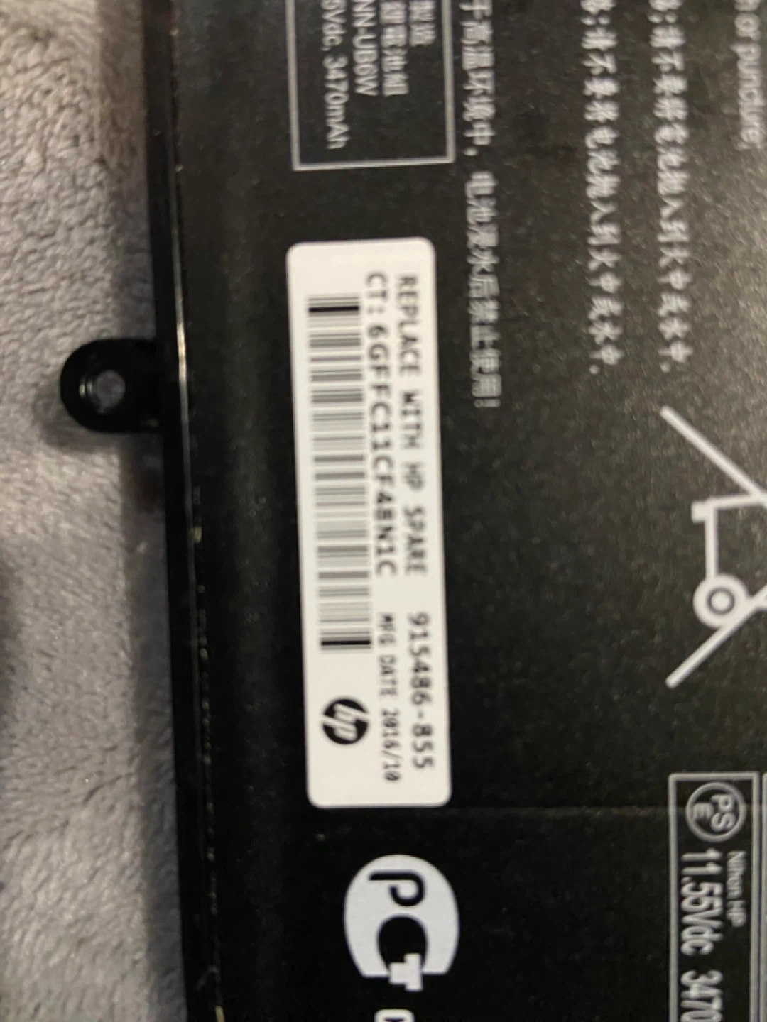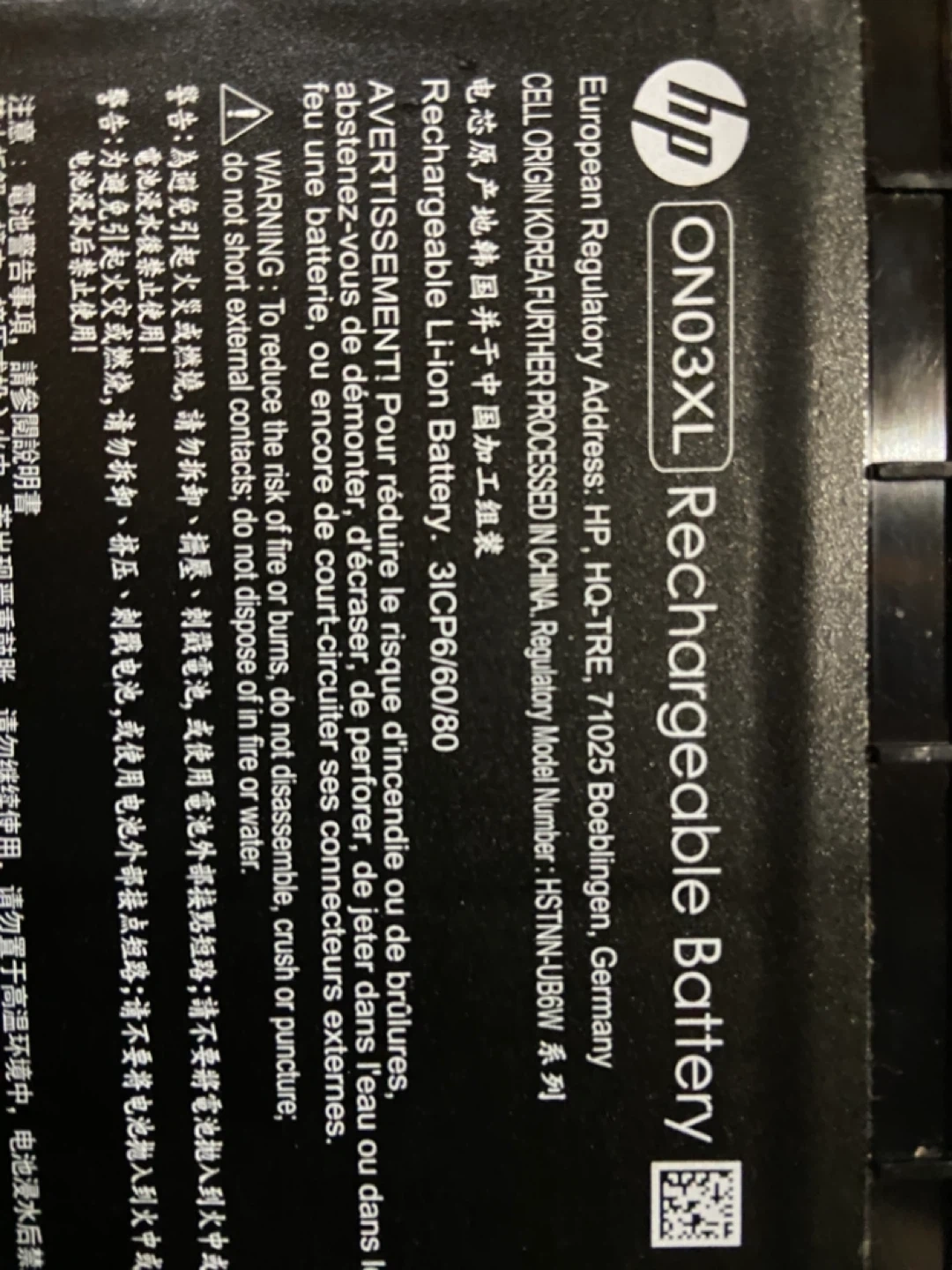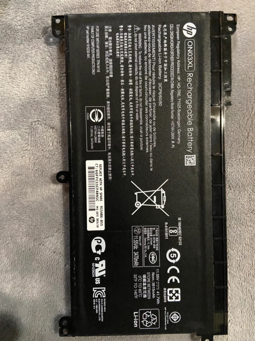 This is an HP ON03XL rechargeable Li-ion battery. It's rated at 11.55V, 3470mAh, 41.7Wh. Manufacturing date is 2016/10. Aaking 10 laptop screen broke so kept battery