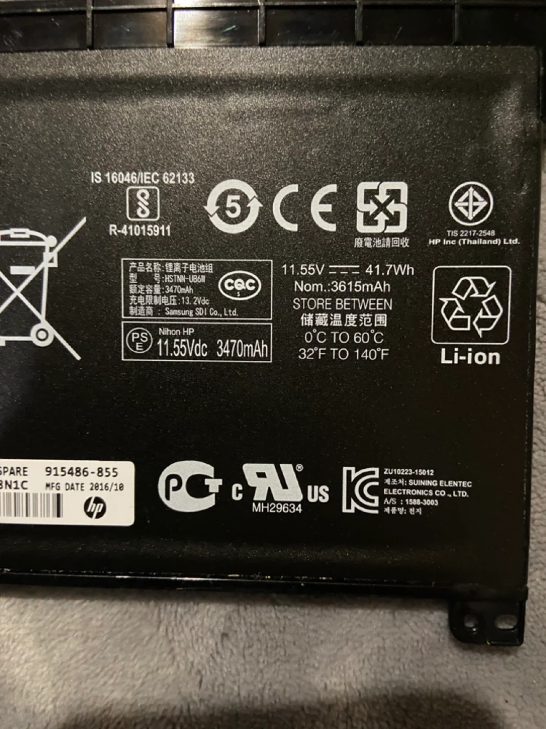 This is an HP ON03XL rechargeable Li-ion battery. It's rated at 11.55V, 3470mAh, 41.7Wh. Manufacturing date is 2016/10. Aaking 10 laptop screen broke so kept battery