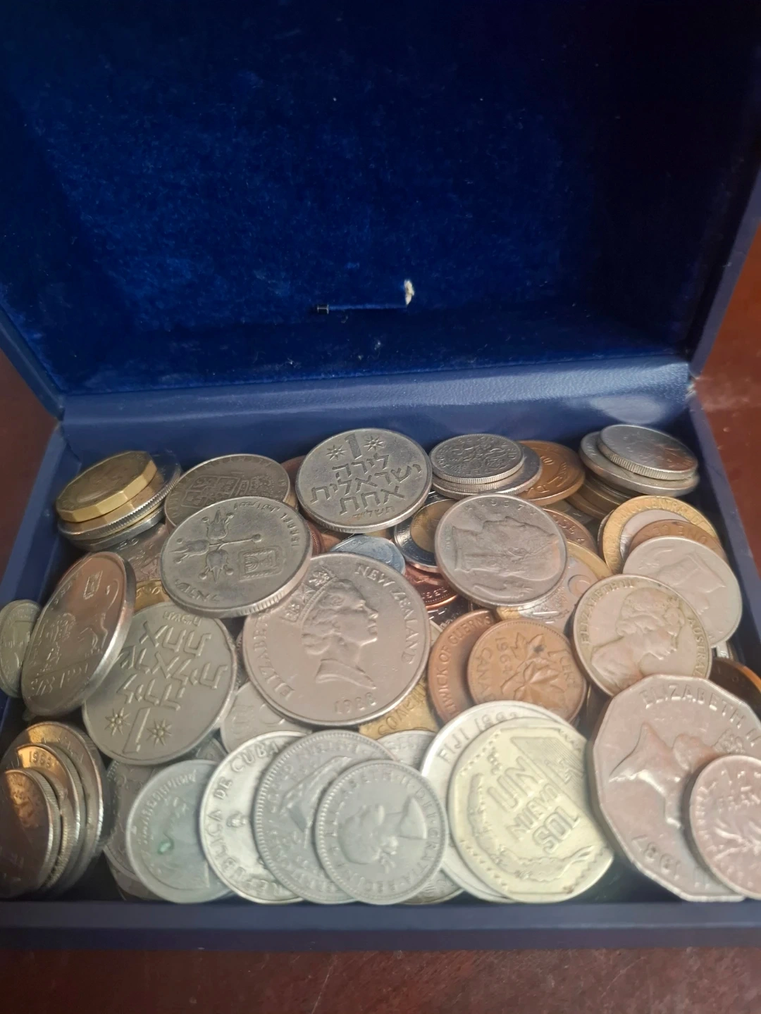 This is a collection of various international coins presented in a blue velvet-lined box. Includes coins from Israel, New Zealand, Fiji, Cuba, and Canada, among others. A great way to start a coin collection or add to an existing one!