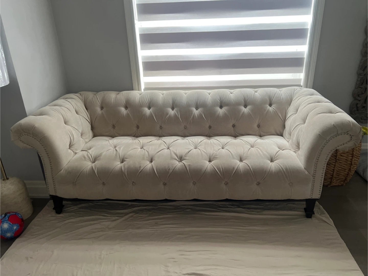 10Selling a beautiful tufted chesterfield style sofa. It's in great condition and would look lovely in any living room or den. The beige colour is neutral and versatile, matching a variety of decor styles. The classic chesterfield design with its tufted details and nailhead trim adds a touch of elegance to your home. A comfortable and stylish addition to your space!