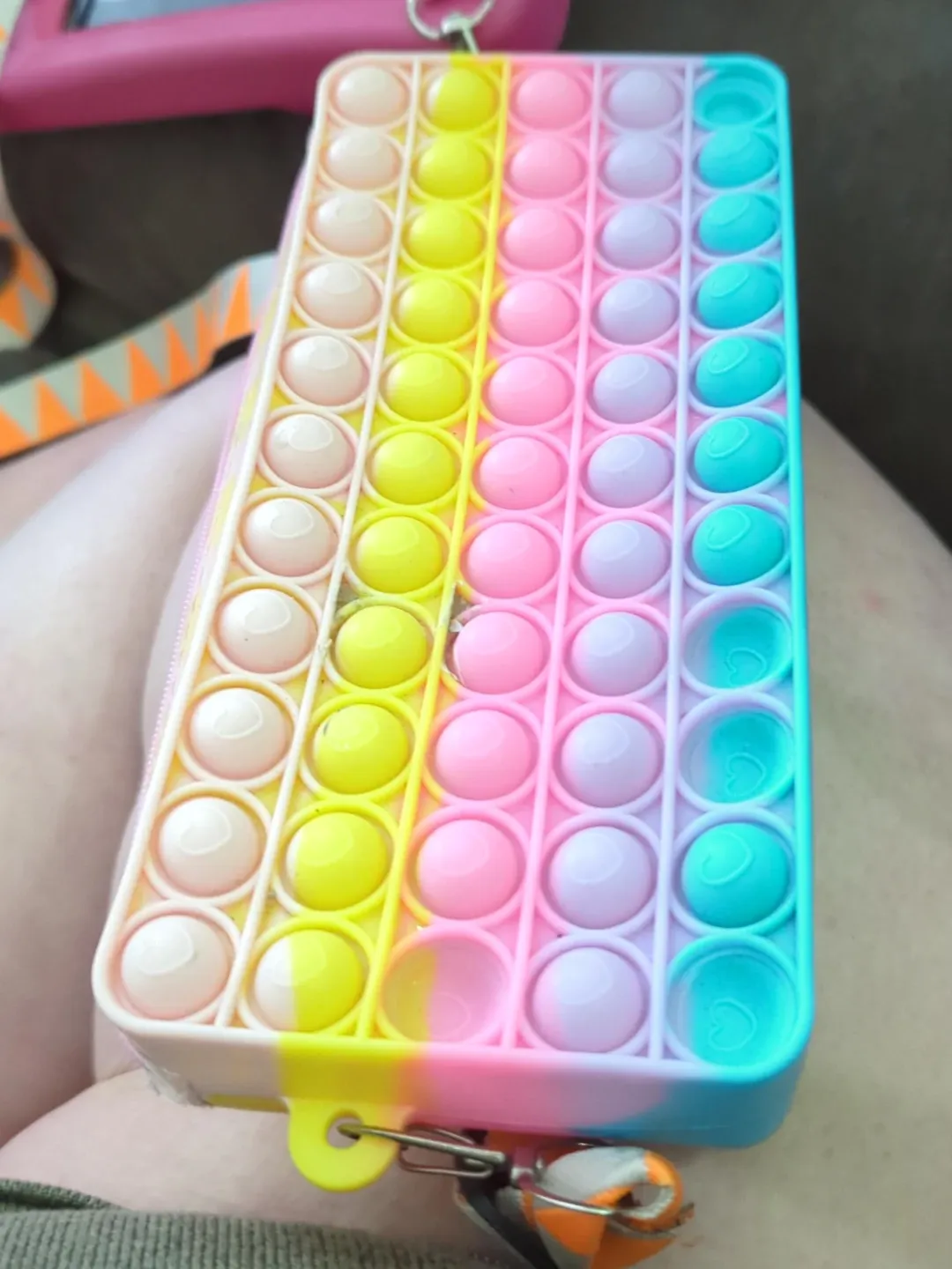 Rainbow coloured Pop It purse with multiple rows of sensory bubbles. It's made of silicone and zips open for storage. A fun fidget toy and purse all in one!
