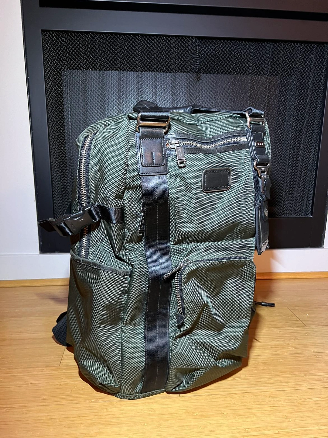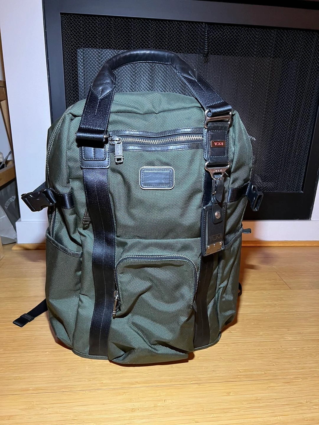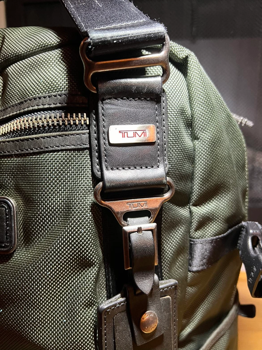 15Tumi Alpha Bravo Lejeune Backpack Tote, Spruce Used some times only. The condition is excellent ** Price is firmed - Military-inspired backpack with leather top-carry handle featuring hide-away shoulder straps - Front U-zip pocket, waterproof side pockets, and additional zip pocket - Measures 18 1/2" x 12" x 8" << Pickup Location >> HMart Downtown 590 Robson St Vancouver