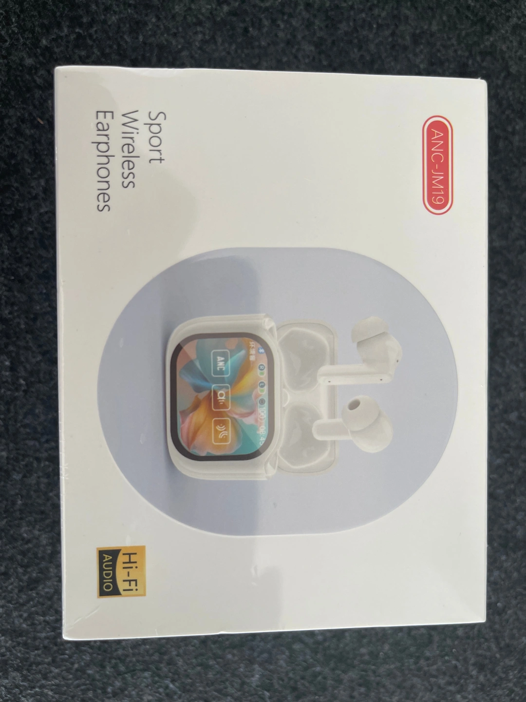 Sport wireless Bluetooth earphones with touchscreen charging case.