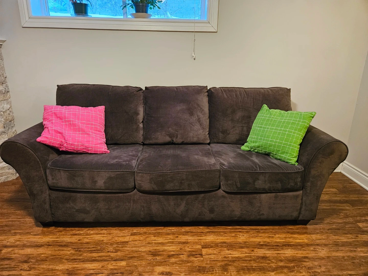 A very comfortable dark brown sofa with three seat cushions and three back cushions. The material is a soft fabric. It is in excellent condition.
