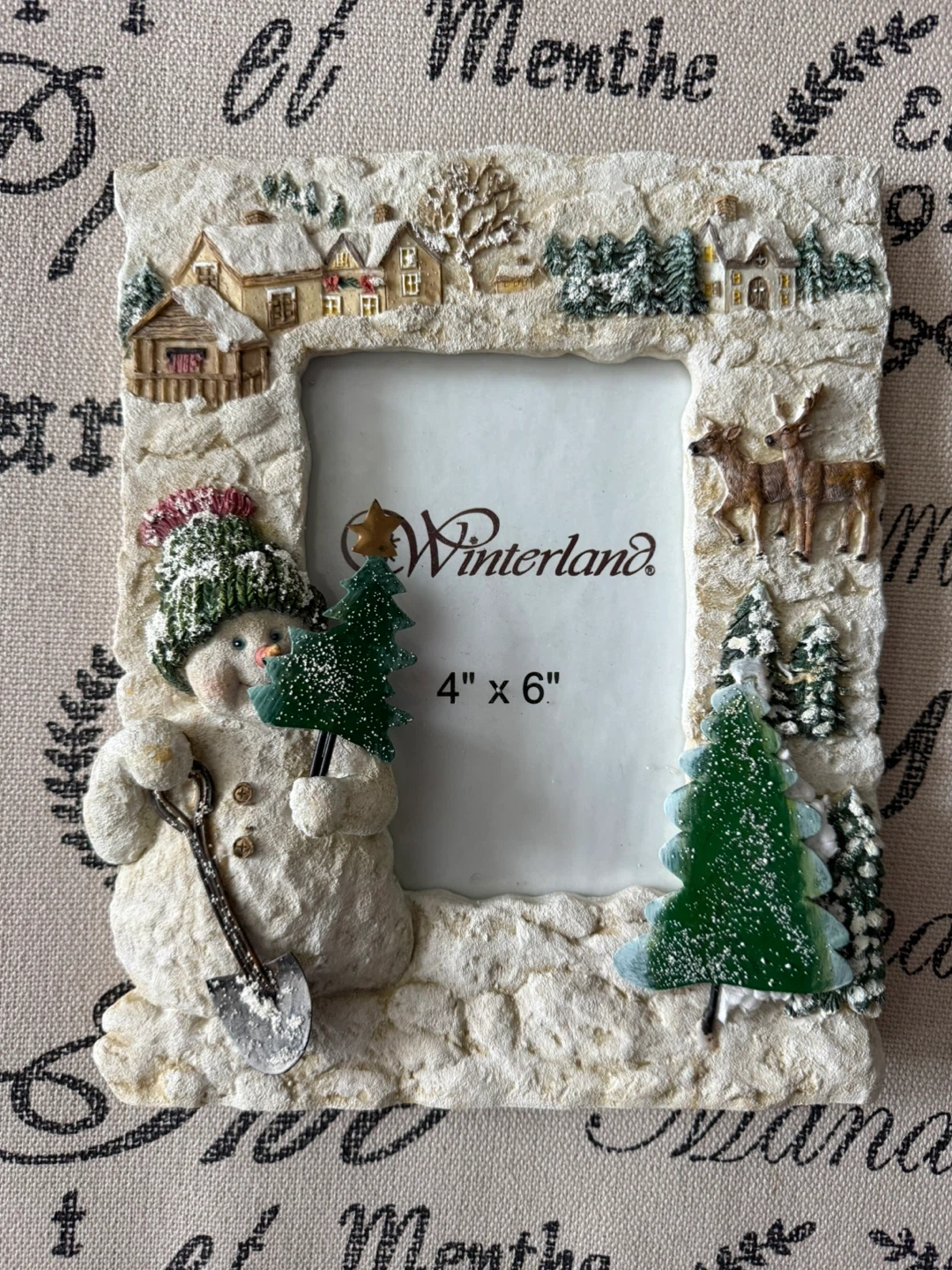 Cute Winterland photo frame featuring a snowman, Christmas trees, and deer. It holds a 4" x 6" photo. Perfect for displaying holiday memories!