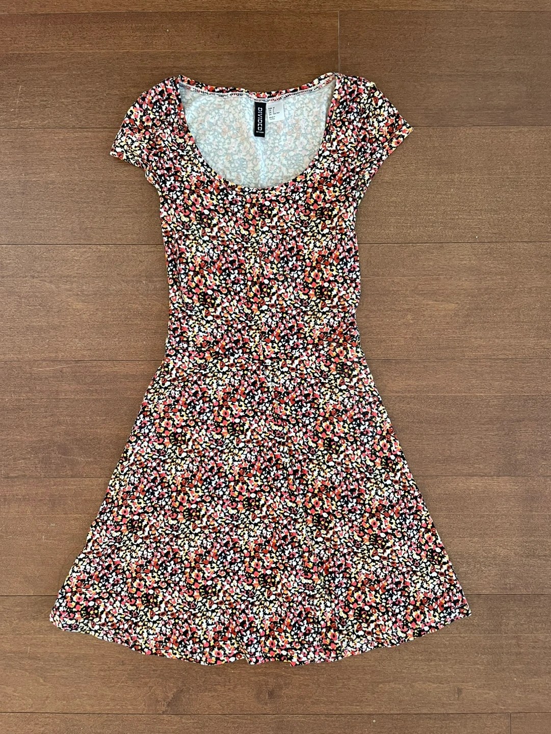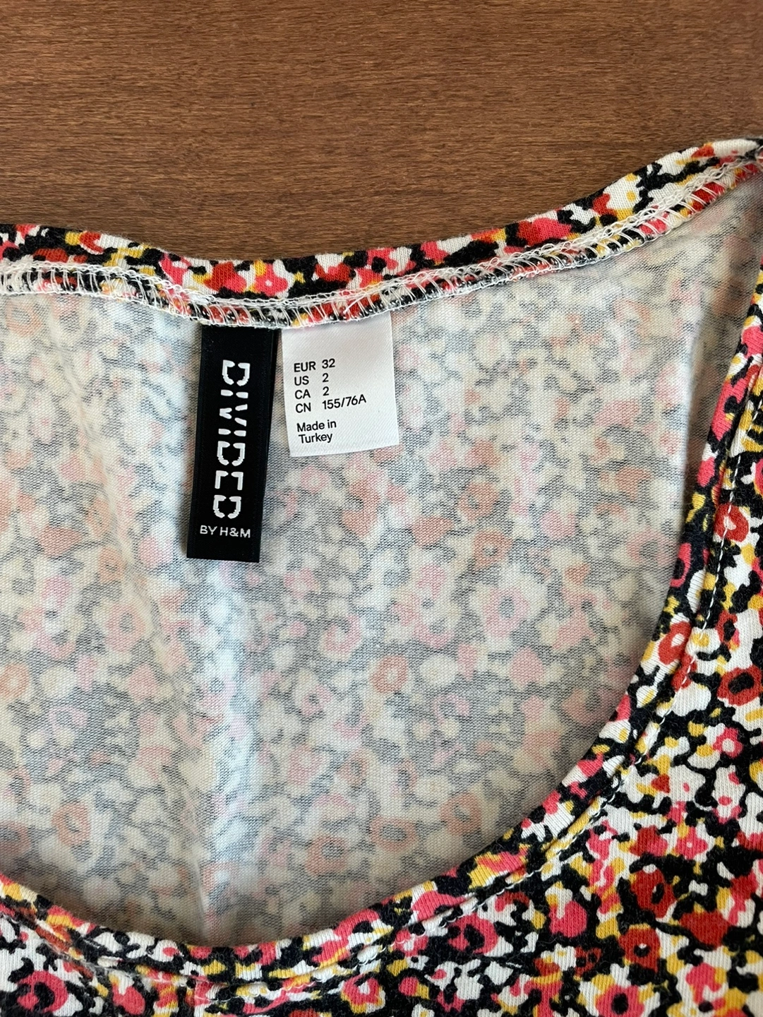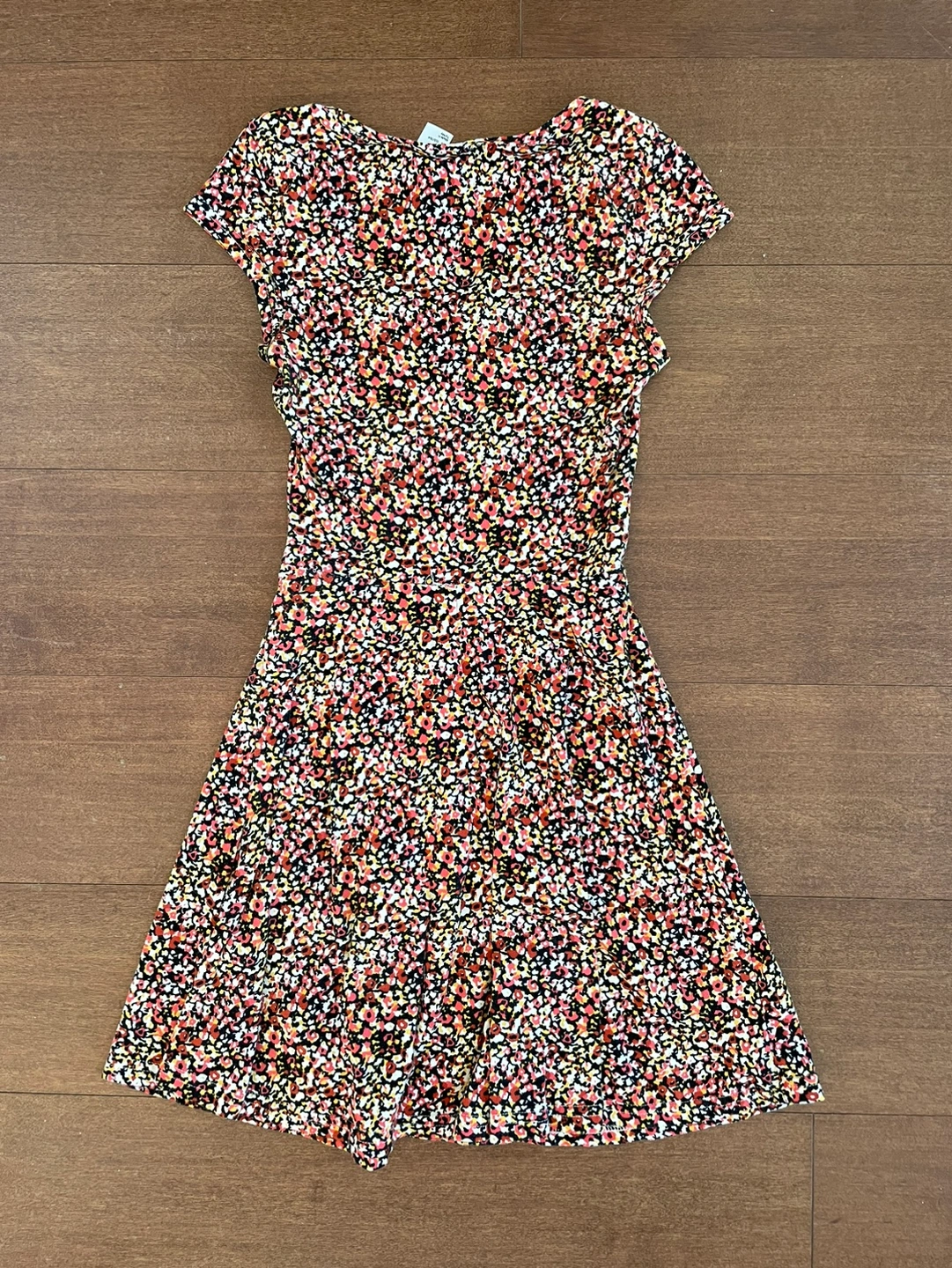 Floral summer dress from H&M. Fits pretty true to size. Hugs the waits and flares out a bit at the skirt. So so cute and so flattering! I got a lot of use out of this dress and I hope it gets a little extra life with someone else.