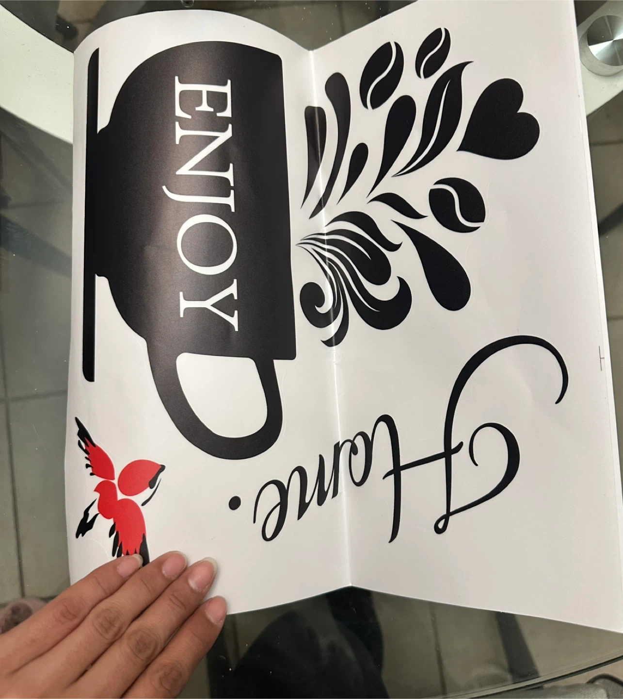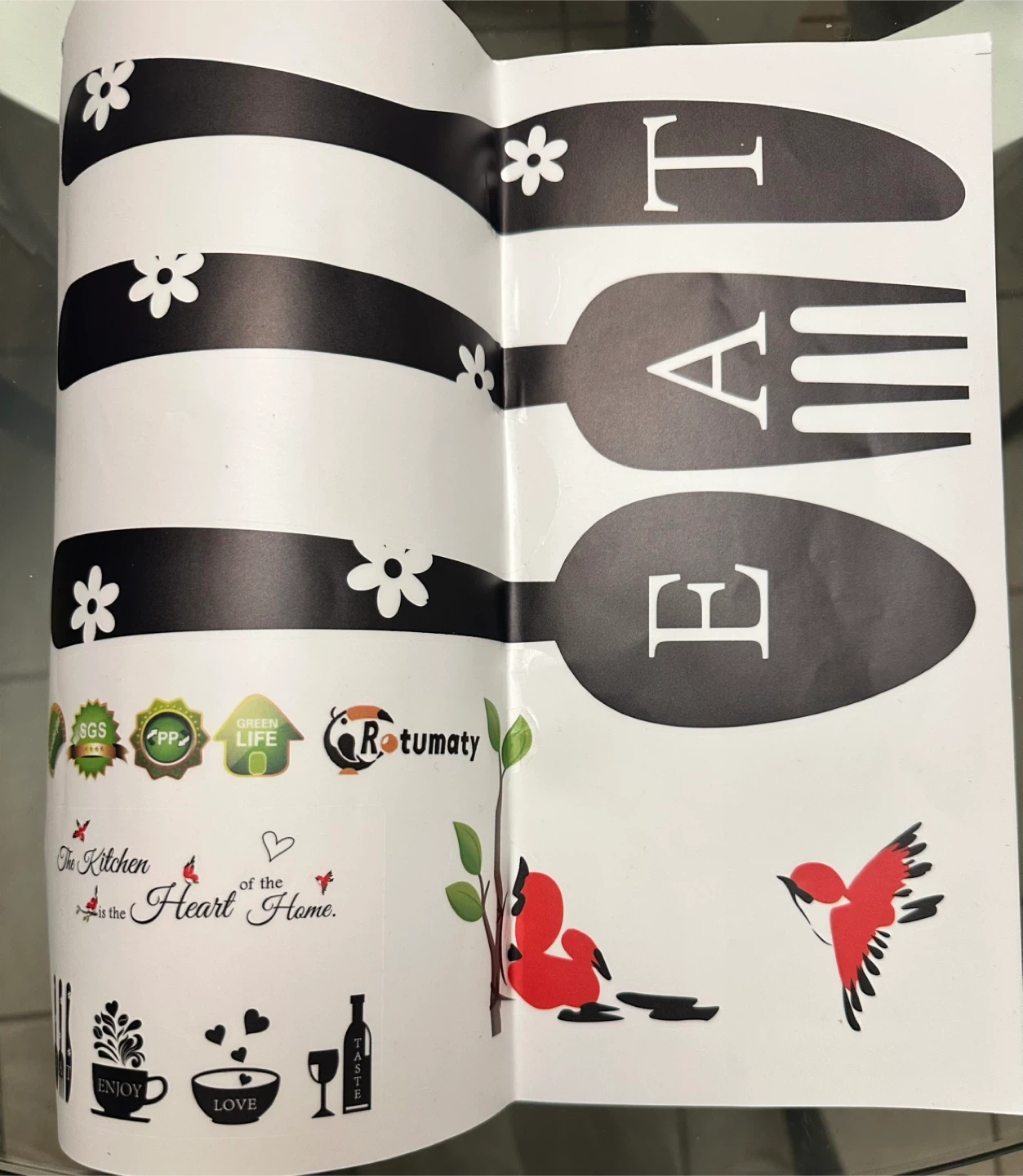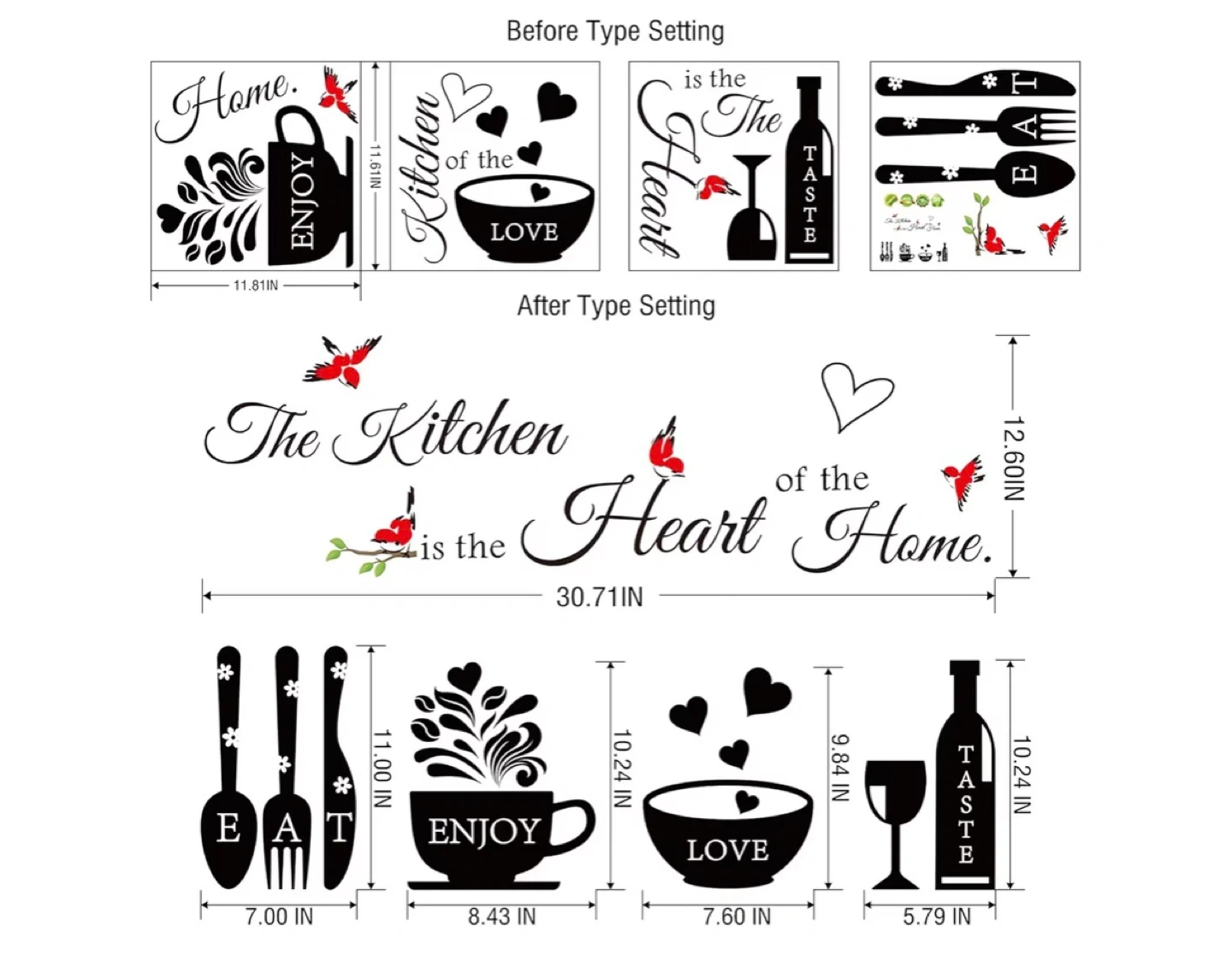 This kitchen wall decal set includes a variety of decorative elements. It features text like "Enjoy", "Love", "Taste", and "Home", along with graphics of cups, bowls, wine bottles, and cutlery. The main phrase reads "The Kitchen is the Heart of the Home". The decals are made from vinyl material and are designed for easy application to walls.