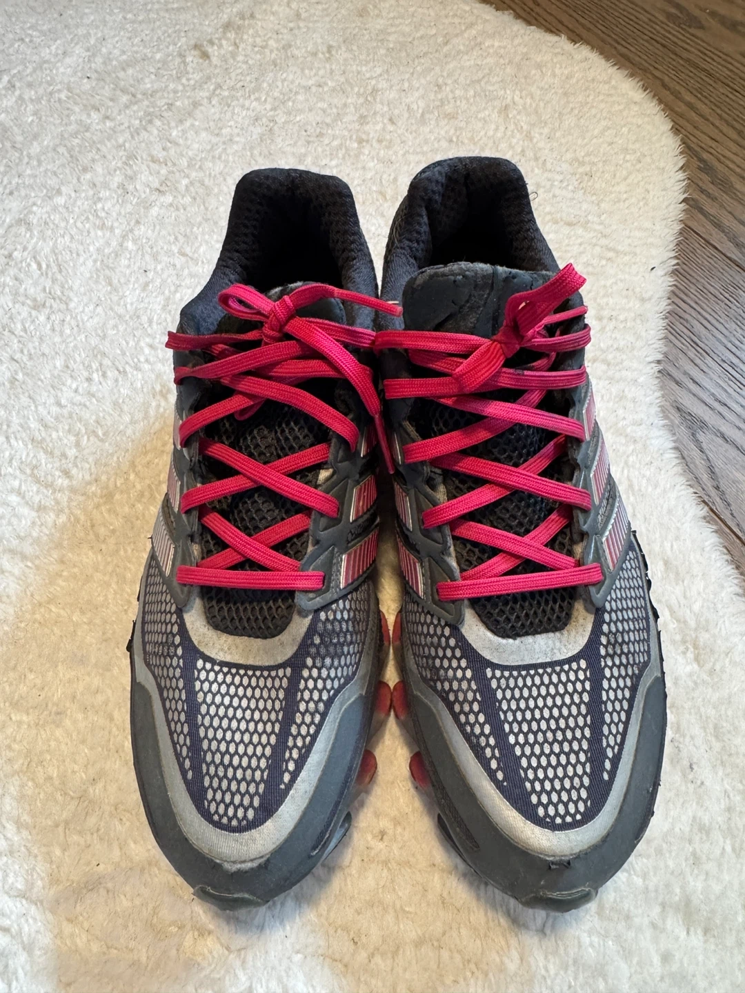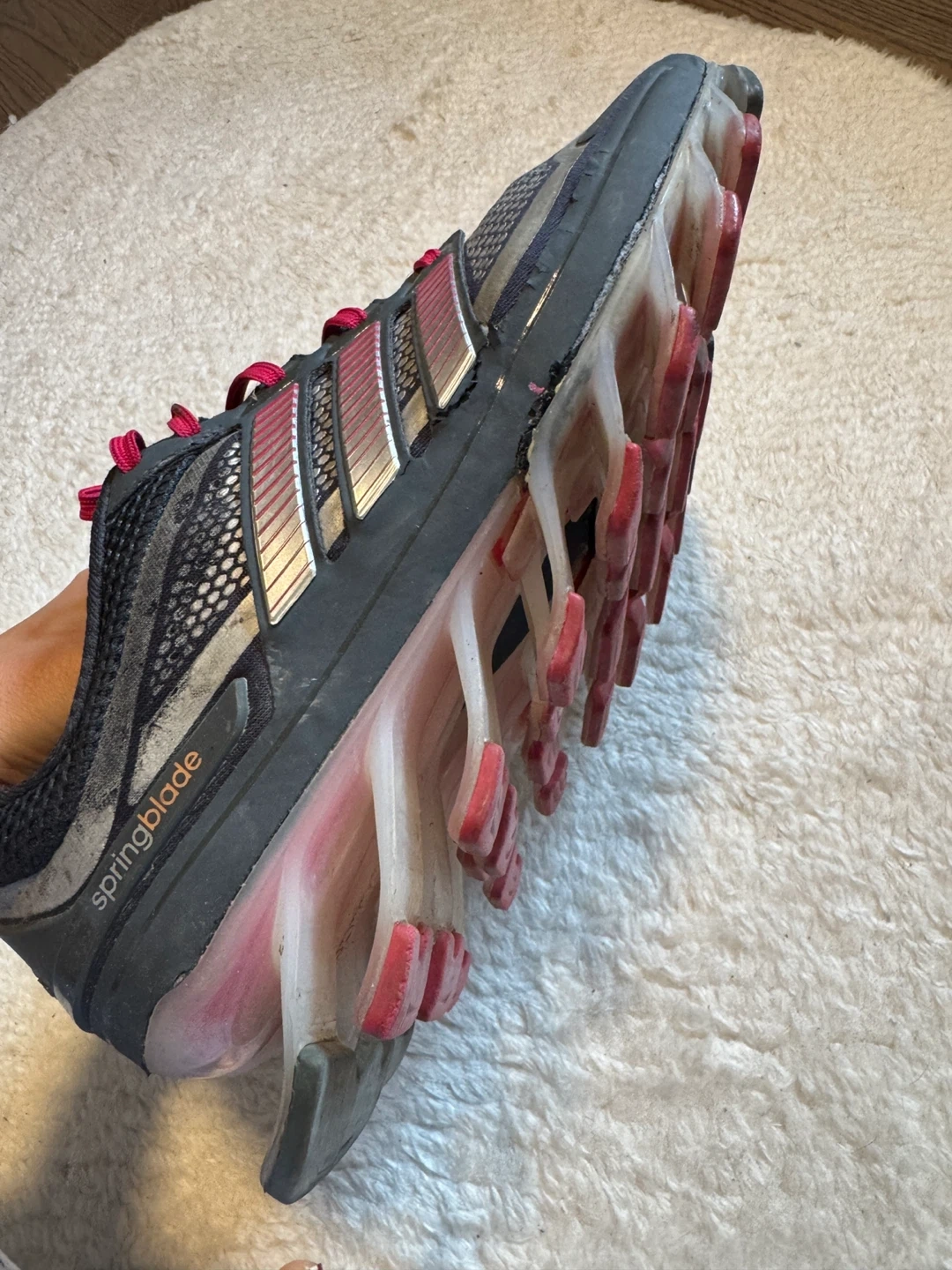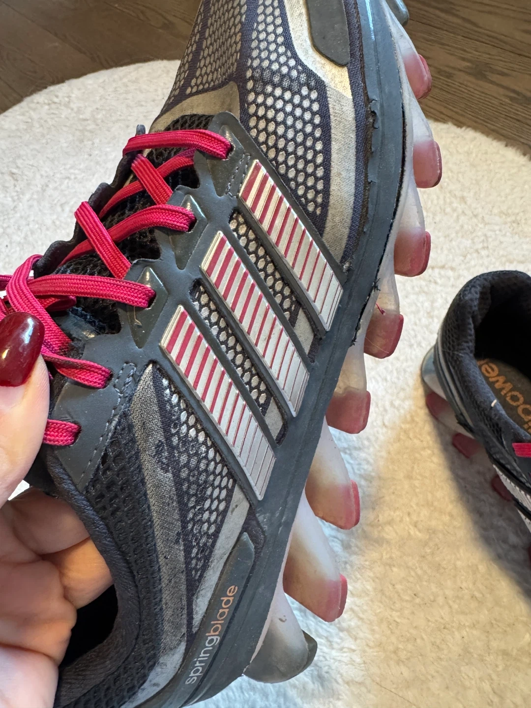 These Adidas Springblade running shoes come in a grey, black, and pink colourway. They feature the signature Springblade sole technology for responsive cushioning. Great for athletic activities!