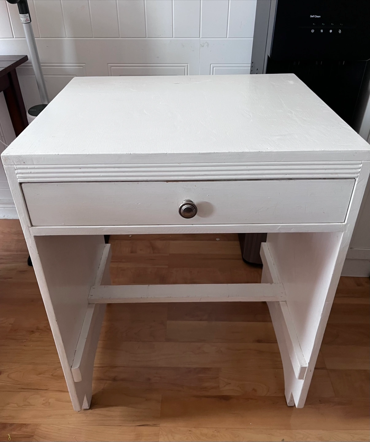 Small white desk with a single drawer for storage. It's solid wood, painted white and has a metal knob on the drawer. Can be repainted to match your aesthetic.