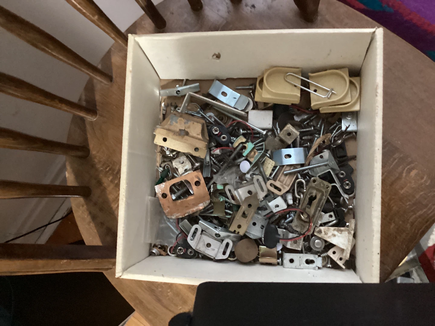 A box filled with various metal and plastic hardware pieces, screws, and fasteners. Includes brackets, anchors, and other assorted components. Useful for DIY projects and repairs.
