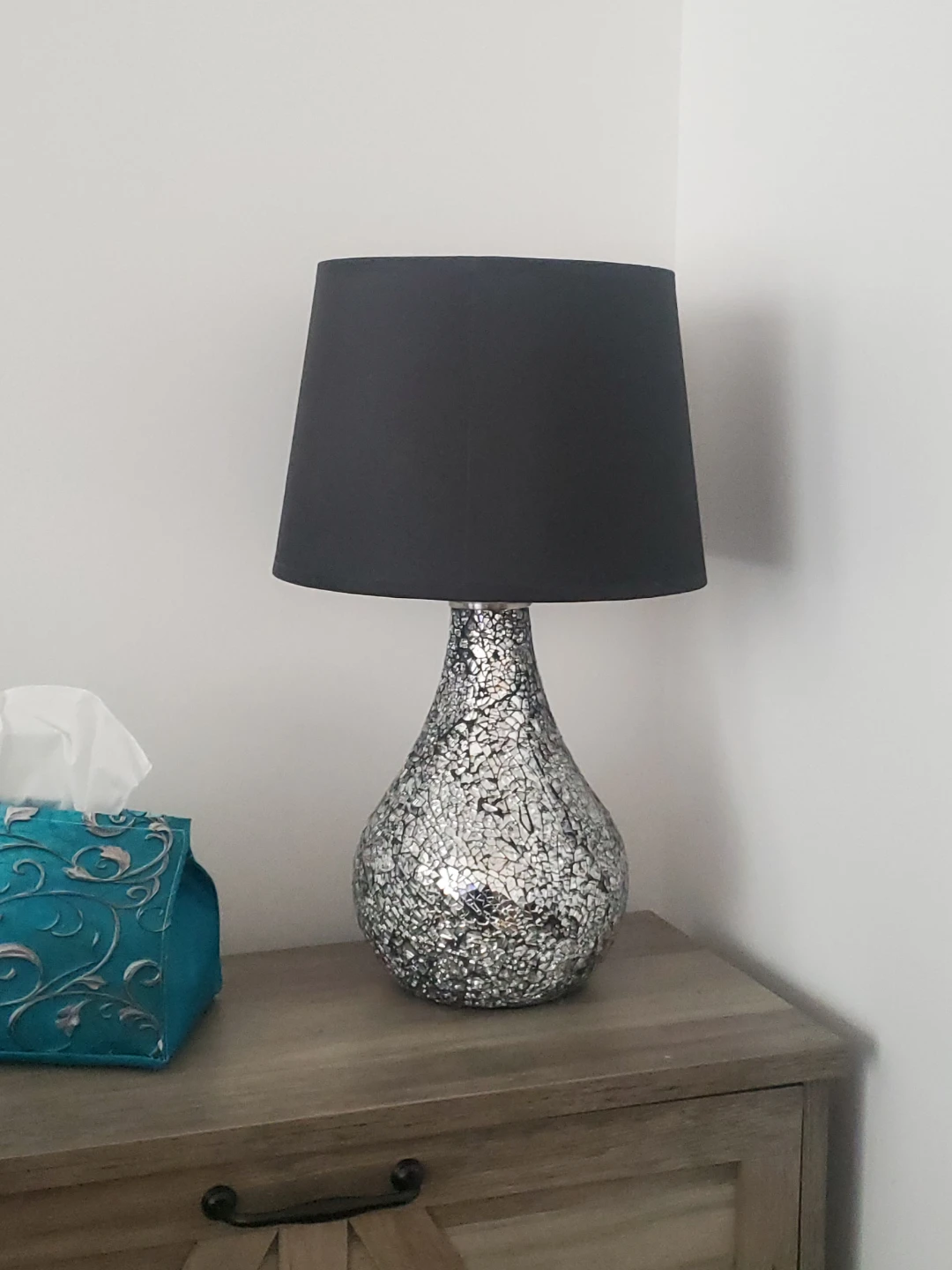 Beautiful table lamp featuring a unique mosaic-style base and a classic black fabric shade. It's a striking accent piece for any room! Provides warm, ambient lighting.