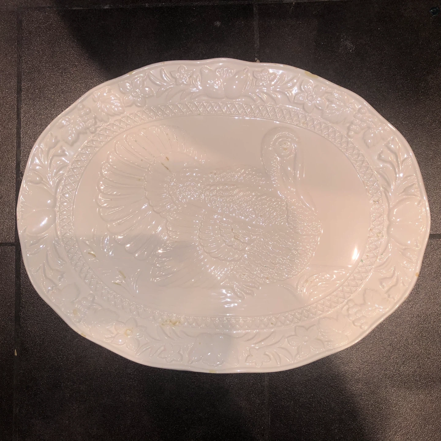 Selling a lovely turkey platter! It features a beautiful embossed turkey design, perfect for your next holiday gathering. It's in vintage condition (it does have a few chips and a few spots are discoloured) and ready to grace your table. It’s 18” long, and very heavy. You could also use it as a basis for turkey-themed decoration!