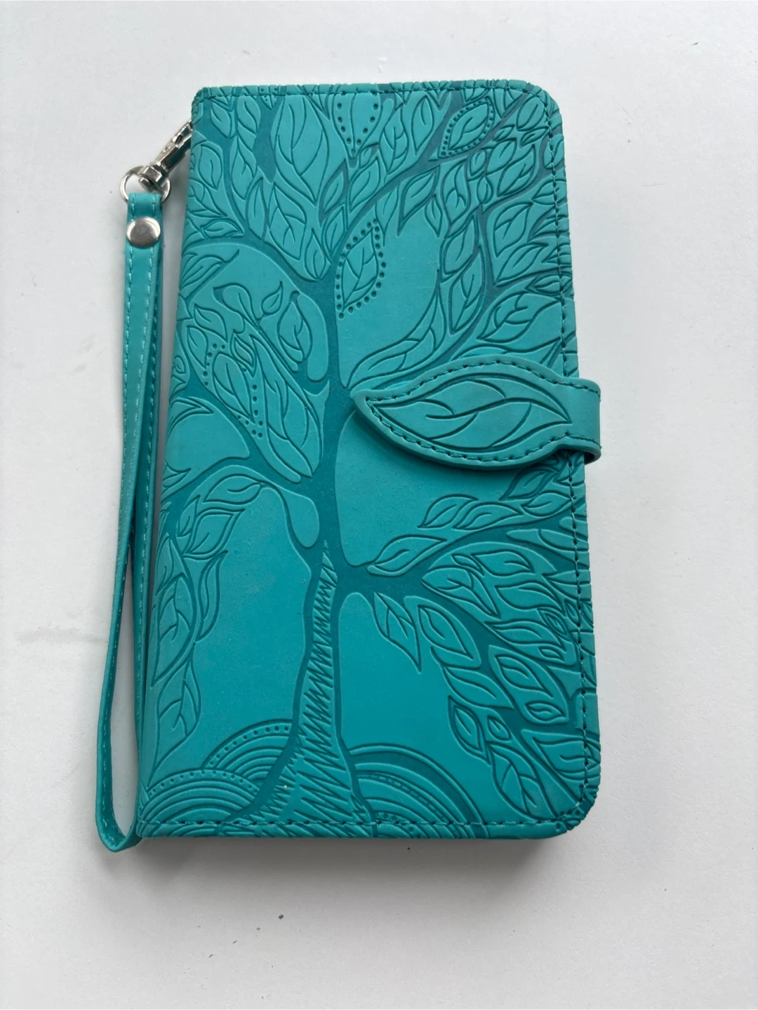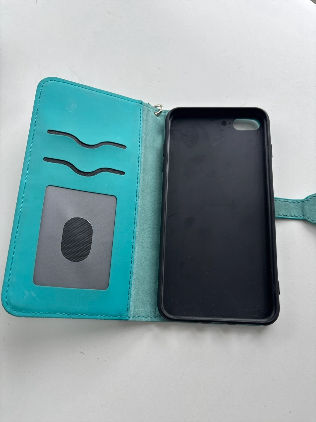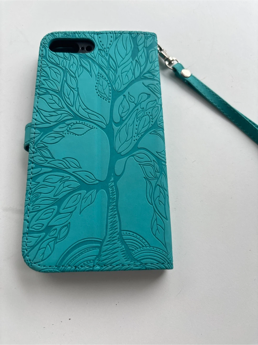 Selling a turquoise wallet case for an iPhone 7 or 8. It features a beautiful tree design and has slots for cards and ID. It's in great condition and ready for a new home!