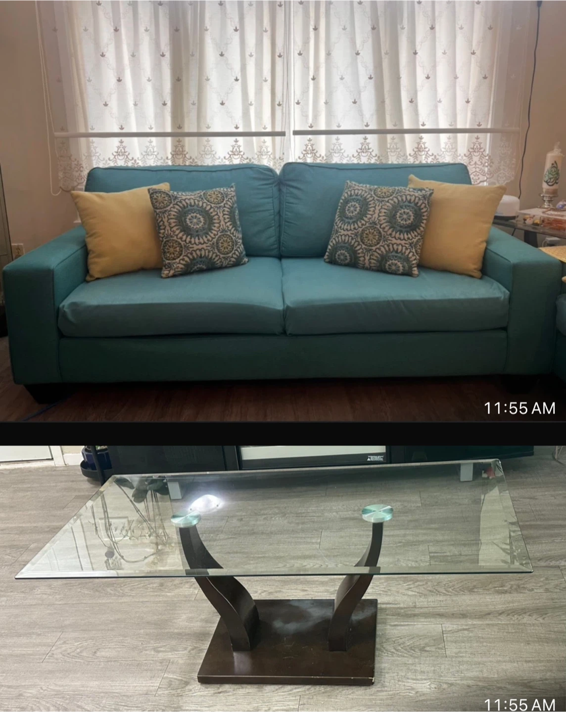 Selling a comfy turquoise sofa and a stylish glass coffee table! They've been well-loved and are ready for a new home. Perfect for adding a pop of colour to your living space Whole set 2 sofas 3seater+ coffee table + sides tables $700