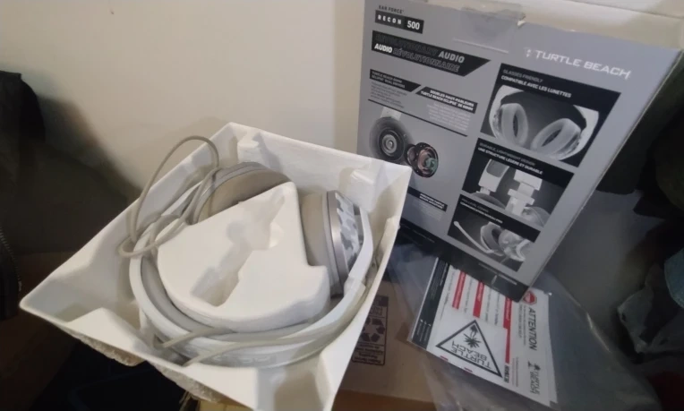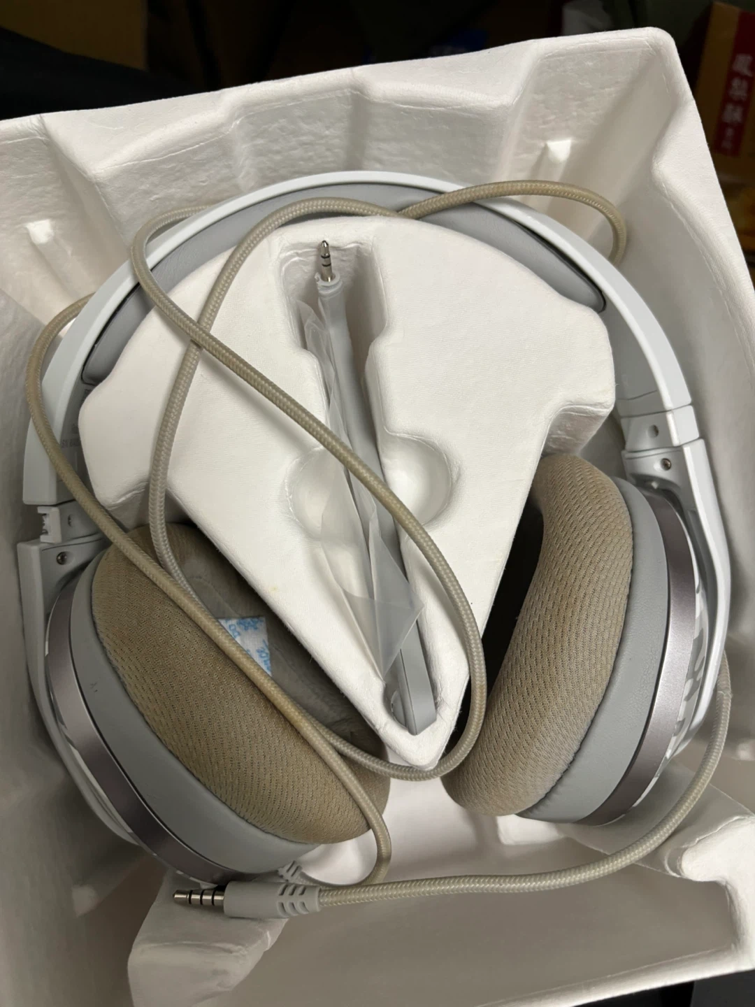 Wired gaming headset. White and camo design. Multiplatform compatibility. Excellent sound quality, the fabric turned yellow but clean. Includes original packaging.