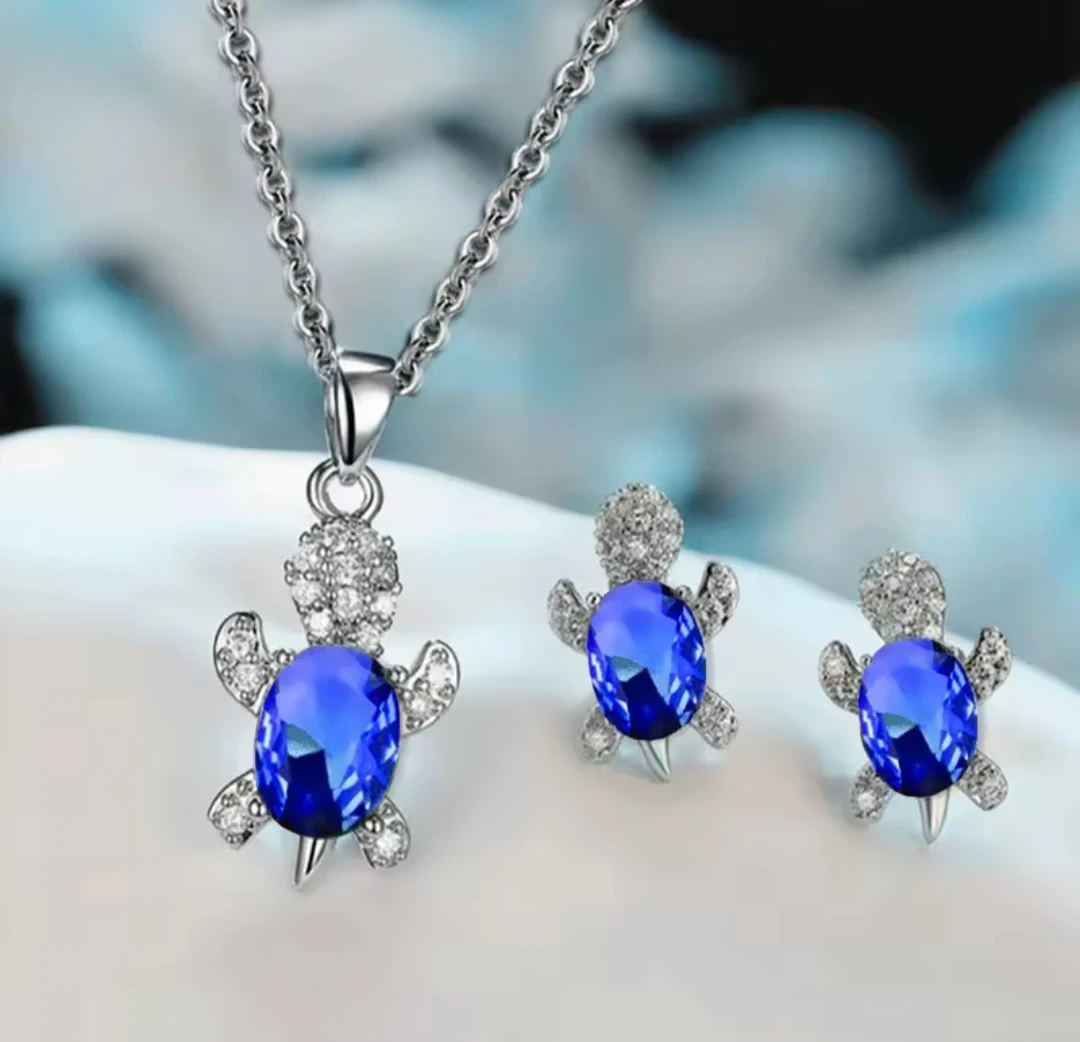 74Cute turtle pendant necklace with matching earrings! The set features a silver-tone chain and turtle pendants with a large blue stone and sparkling accents. Perfect for adding a touch of whimsy to any outfit